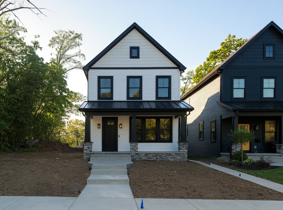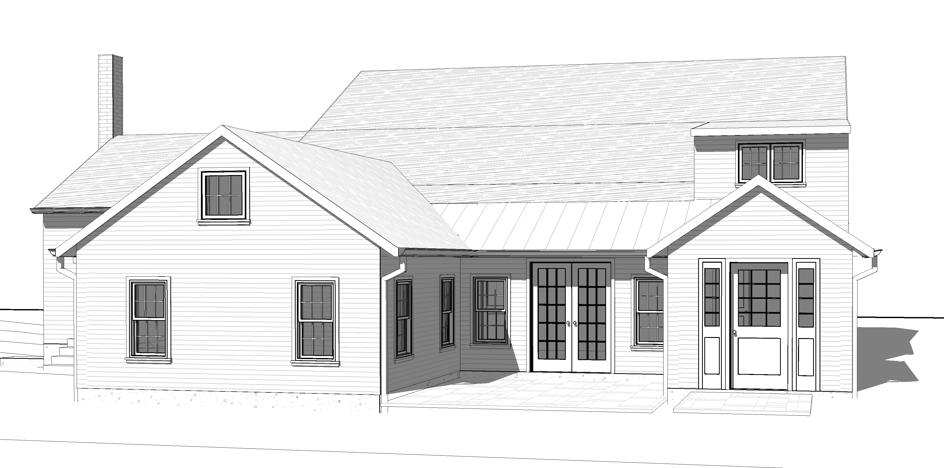render a charming country style house with a warm inviting atmosphere set in new england in the fall the house should have dark grey clapboard siding and a dark gray shingled roof with a copper standing seam metal roof over the pair of french doors out to the patio the front doors and window frames feature a sleek dark finish to match the siding the small porch area has natural rock and bluestone landscape the surrounding environment is lush and vibrant with a bright blue sky and soft diffused sunlight that enhances the cozy and timeless feel of the home incorporate green grass and a few flowering shrubs around the house to add a touch of nature architecture