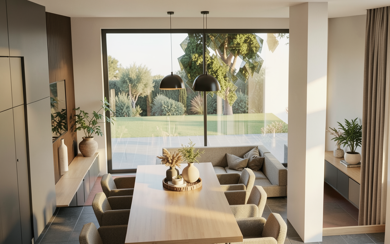 create a hyper realistic visual of this house do not change the design or house proportions make the driveway a cream resin finish and add classy wild planting flowers to the front garden and add cut stripes into the grass where possible add trees and planting in the background show the back brick on edge detail as per the original image dont change the angle of the camera