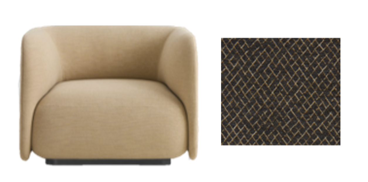 change the fabric of the chair to the brown patterned fabric on the swatch on the right remove swatch and center the chair keep all proportions the same keep all else the same