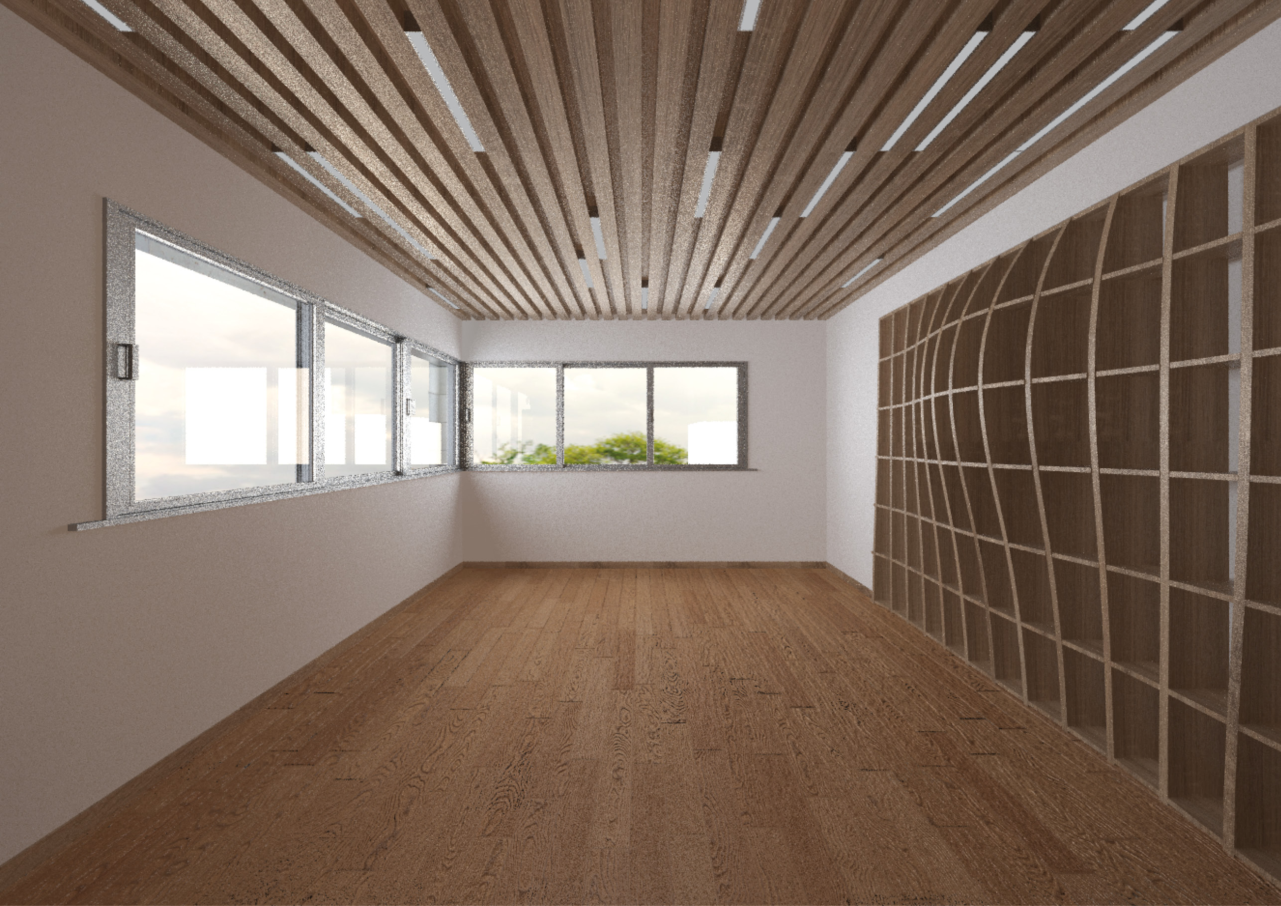 more realism and warm sunny light add a office table in the cenbooks in the curved shelfter and