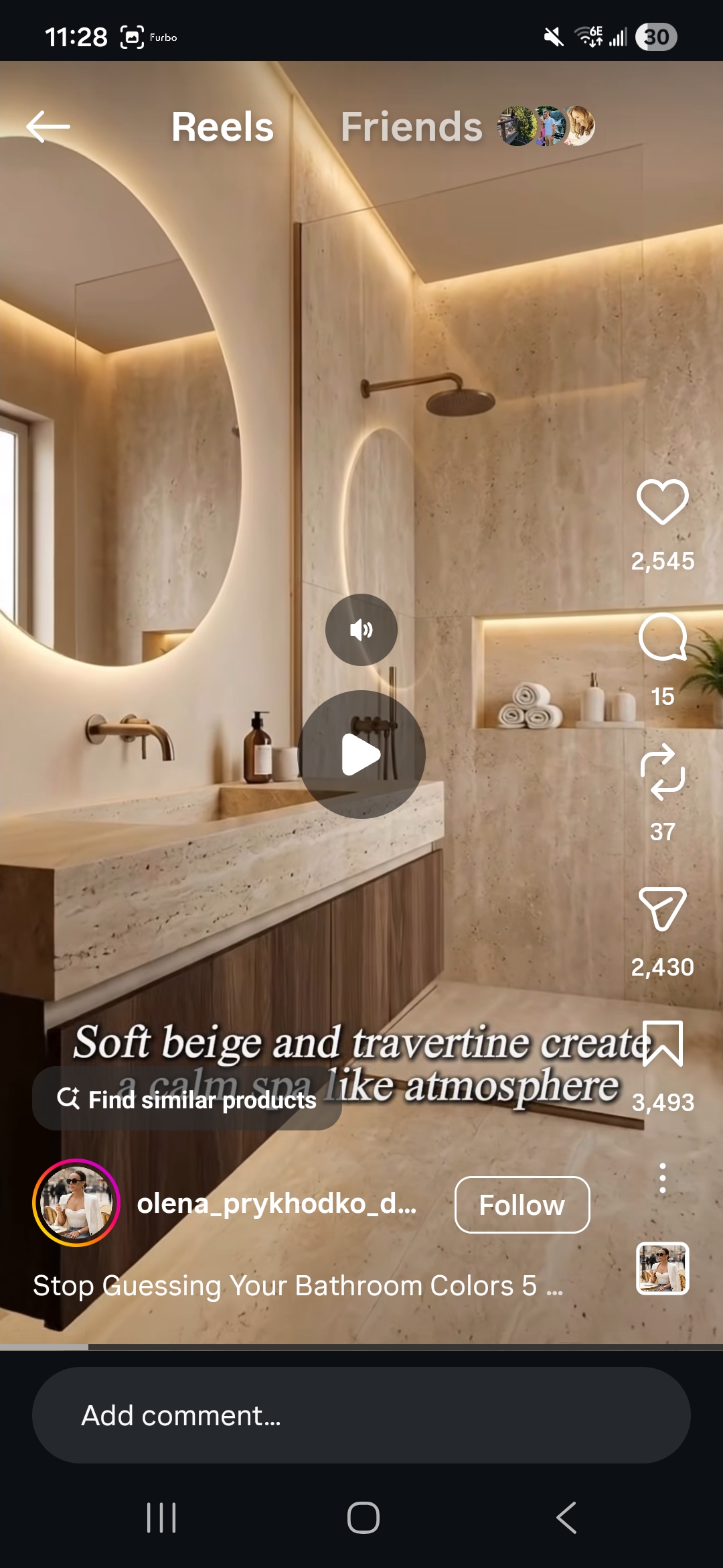 exterior shot render a luxurious ensuite bathroom with a serene atmosphere place a large elegant freestanding bathtub on the left with a glossy white finish above it add a large window with sheer curtains allowing soft natural light to flood in to the right include a modern double vanity with travertine countertops and dark oak cabinetry install two stylish circular mirrors above each sink with ambient lighting on the right wall depict a spacious walk in shower with clear glass doors and brushed nickel fittings use travertine tiles in the shower and soft beige tiles on the floor and halfway up the walls transitioning to a calming beige paint above for a spa like atmosphere on the far right include a neatly positioned water closet with toilet and free standing bidet add plants for a touch of greenery and warmth to the space soft ambient lighting should give the room a tranquil and inviting feel