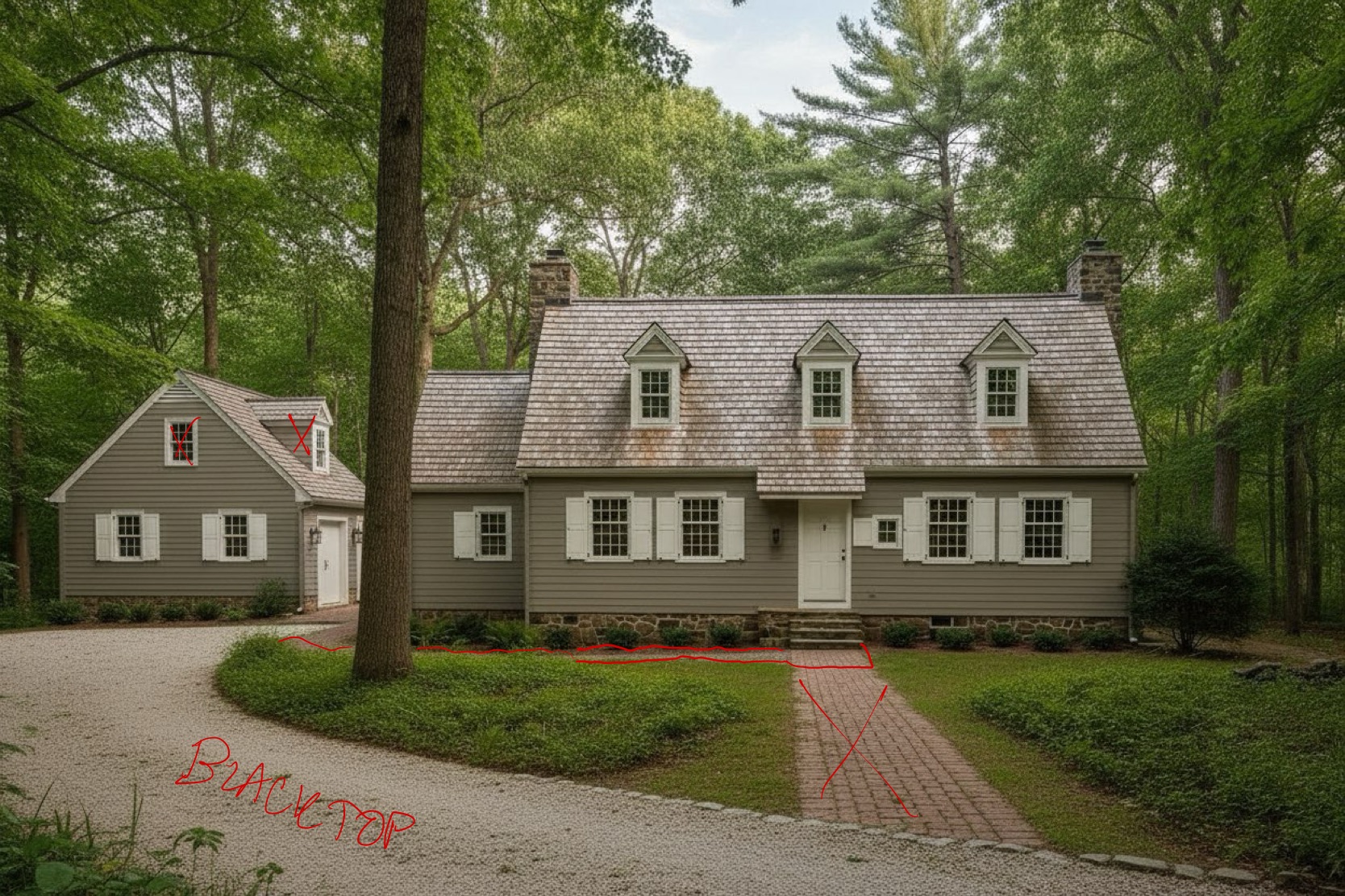remove the dormer on the garage that has a red x remove the window on the garage that has a red x remove the section of brick walk that has a red x make it brick walk where there are lines make the driveway blacktop as annotated