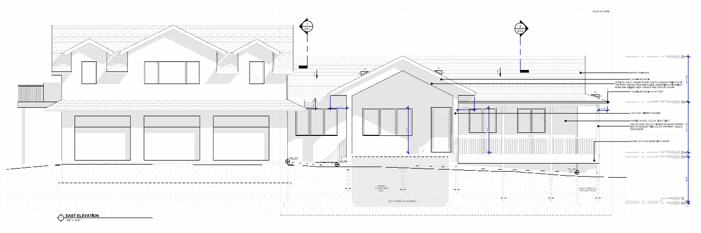 make this a pretty light blue house accurate to drawing with black roof and gray columns and black railing on deck architecture