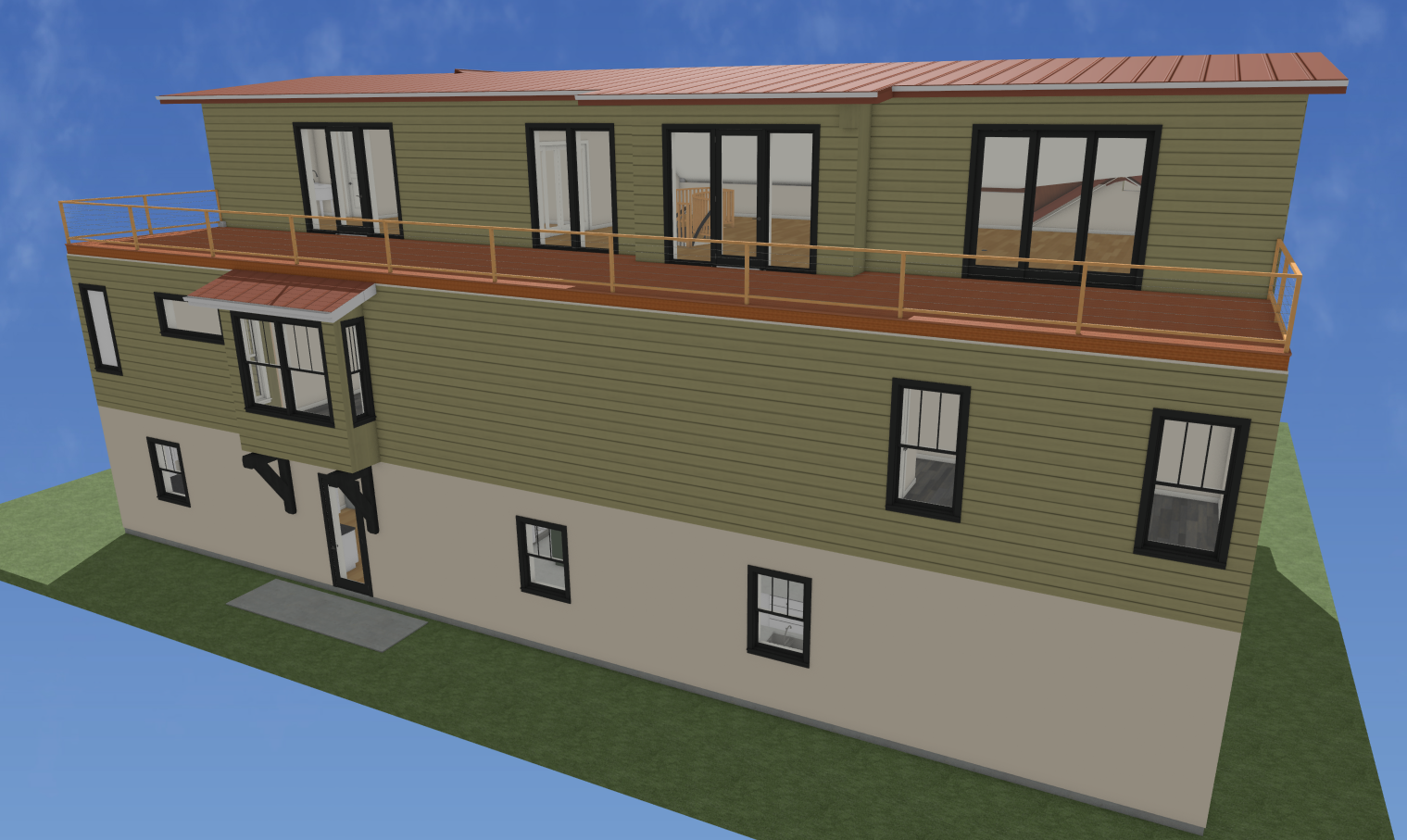 transform this architectural rendering of back of house into a photorealistic exterior visualization with the following specifications driveway hardscaping replace existing driveway with high end interlocking pavers herringbone pattern use warm gray colored pavers with subtle color variation add decorative border pavers in contrasting tone include realistic weathering and natural variation in paver surfaces resort style tropical landscaping lush tropical plant palette featuring palms royal coconut date bird of paradise hibiscus and bougainvillea layer plantings with varying heights tall palms as focal points mid level flowering shrubs ground level tropical foliage add natural mulch beds around plantings include mature specimen trees for immediate impact environmental details soft warm natural lighting late afternoon realistic shadows with proper depth and direction high resolution textures on all building materials atmospheric perspective with subtle depth of field clear blue sky with wispy white clouds quality specifications photorealistic material rendering with accurate reflections and surface properties 4k resolution output suitable for client presentations professional architectural photography style maintain original building proportions and design intent