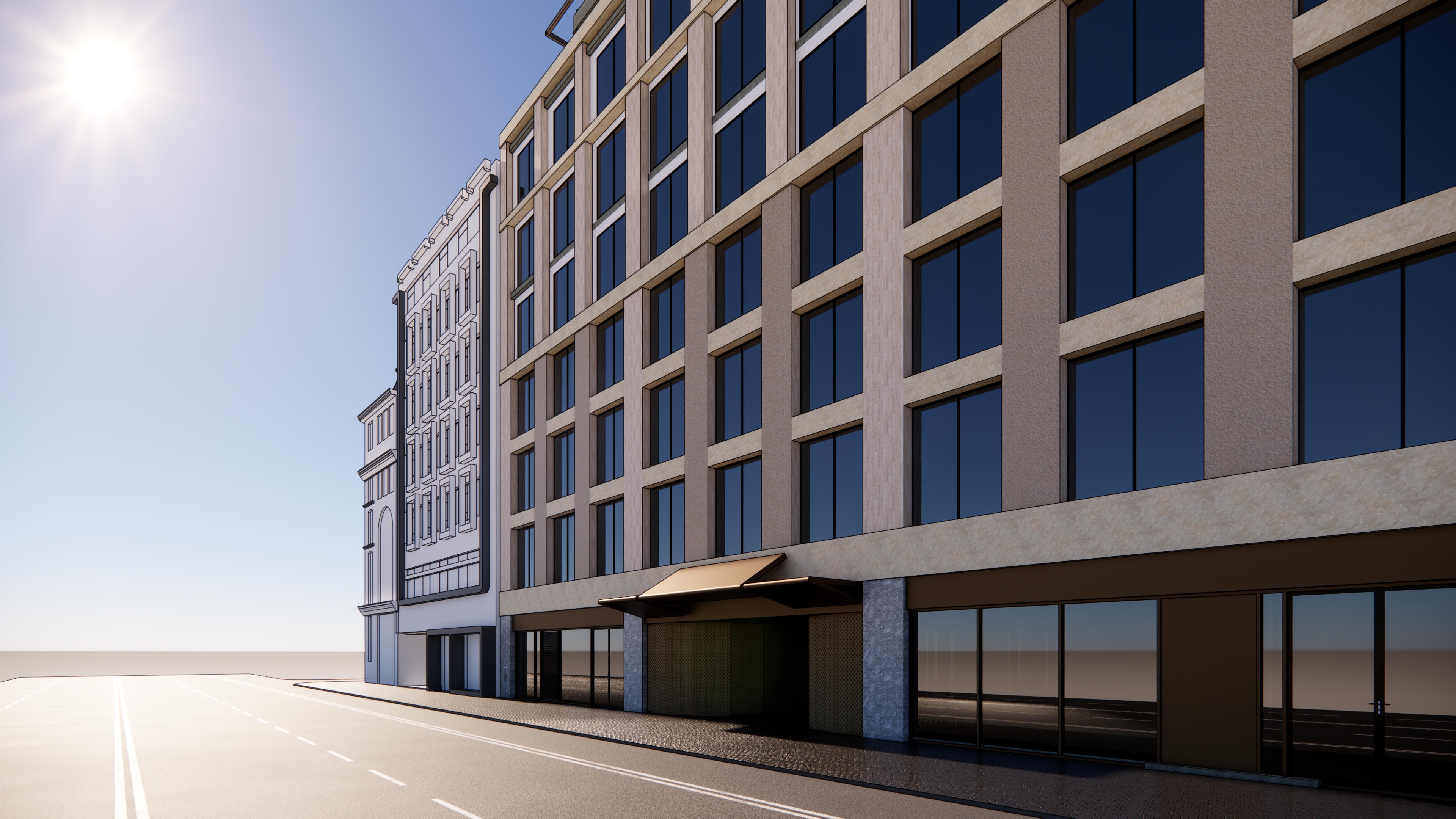 realistic render is an hotel entrance rispect the given materials