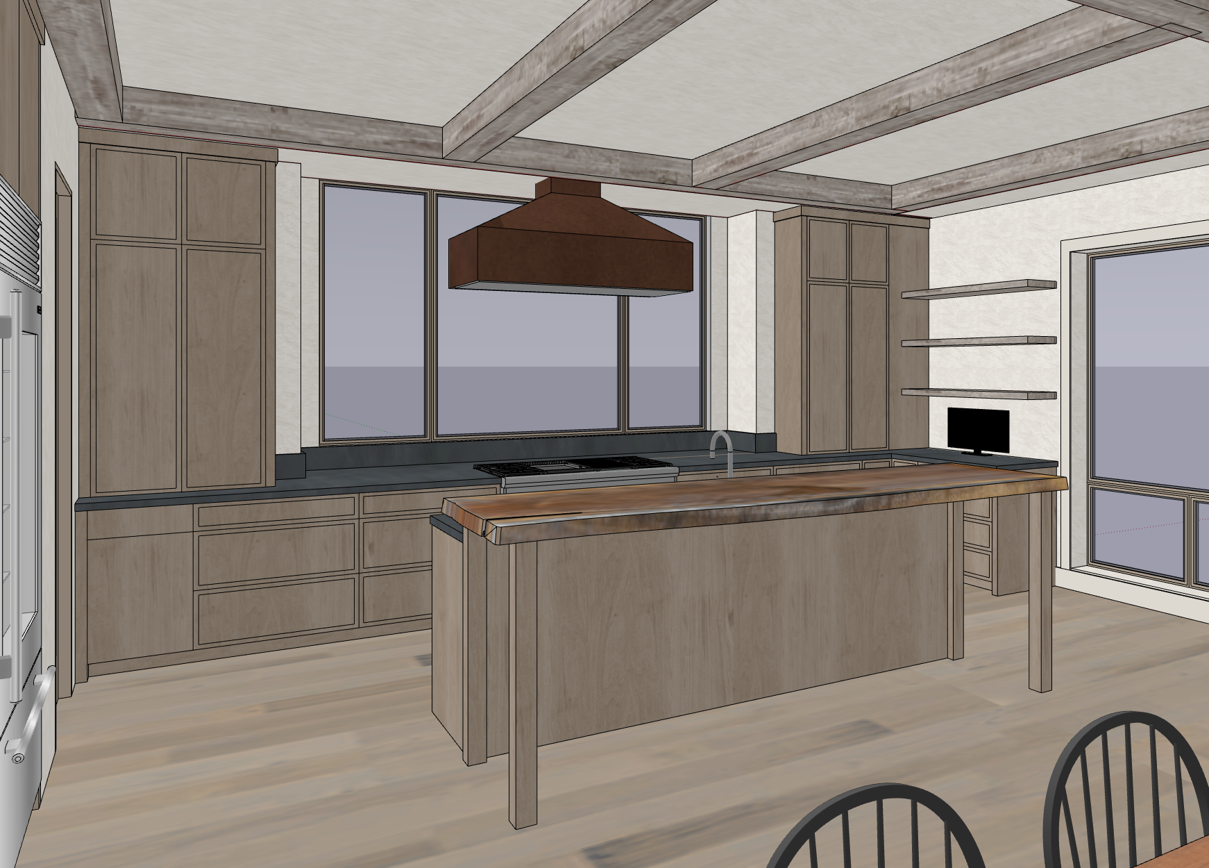 the cabinets are a rift oak the ceiling is a soft white drywall the ceiling beams are a distressed reclaimed grey beam