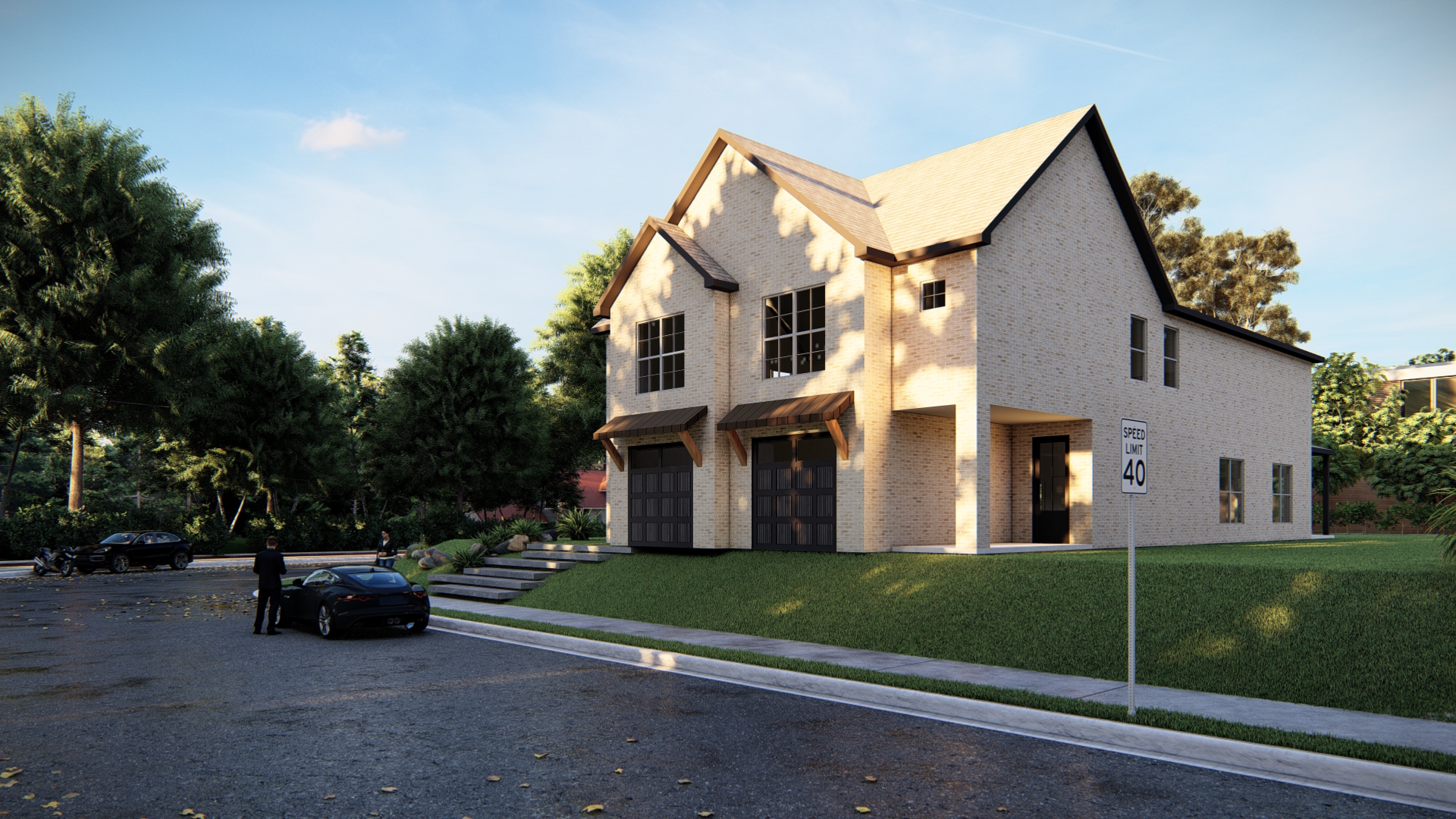 a modern suburban street featuring a central two story house with light beige batt board siding and dark grey roof set on a corner lot and flanked by a single story house on the right dark grey in color with a black roof and another in light gray with a brown garage door the sky is a vibrant blue with scattered soft white clouds mature trees across the street to the left a sleek sky black sports car is parked in the street in front of the home lush green lawns and manicured gardens with small shrubs complement the scene the atmosphere is serene and sunny capturing a peaceful suburban morning