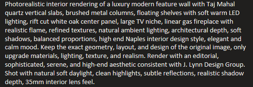 photorealistic interior rendering of a luxury modern feature wall with taj mahal quartz vertical slabs brushed metal columns floating shelves with soft warm led lighting rift cut white oak center panel large tv niche linear gas fireplace with realistic flame refined textures natural ambient lighting architectural depth soft shadows balanced proportions high end naples interior design style elegant and calm mood keep the exact geometry layout and design of the original image only upgrade materials lighting texture and realism render with an editorial sophisticated serene and high end aesthetic consistent with j lynn design group shot with natural soft daylight clean highlights subtle reflections realistic shadow depth 35mm interior lens feel