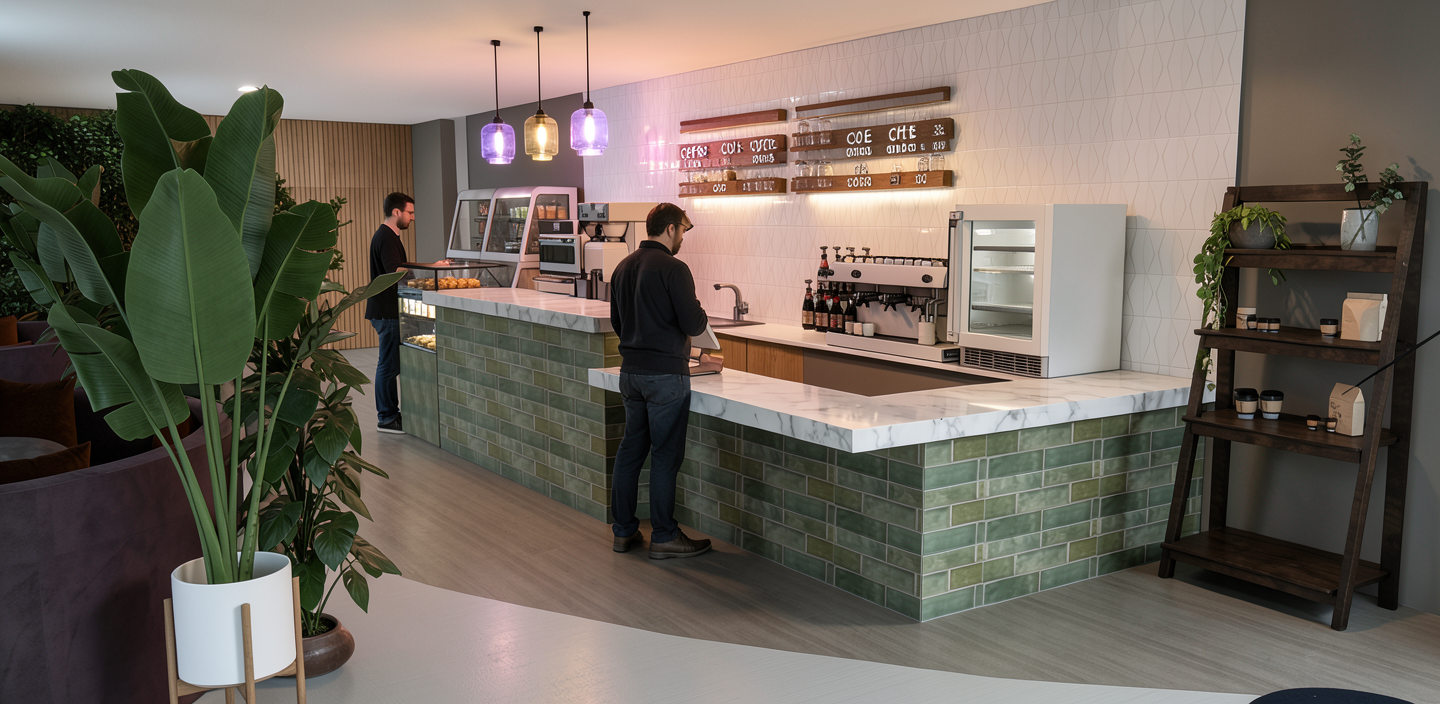 render cabinets in rift cut white oak vertical grain in natural stain finish countertop and backsplash in white carrara marble floor in reddish brick in herringbone pattern