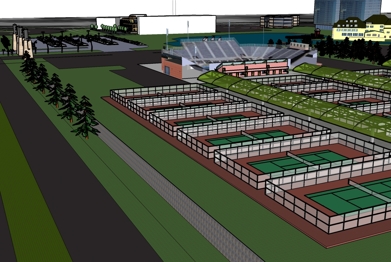 functionalism exterior shot outdoor tennis center and tennis arena lush green grass architecture