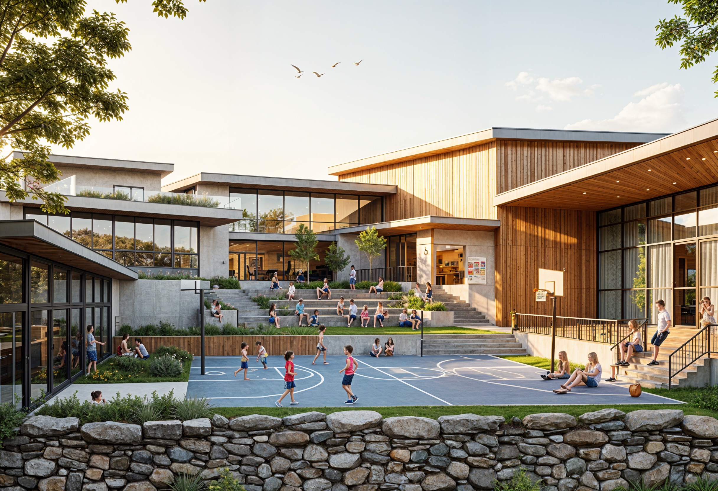 keep all elements of the original picture as is except rotate the sun angle so that the courtyard gets direct lighting render the light realistically in the middle of the day not evening