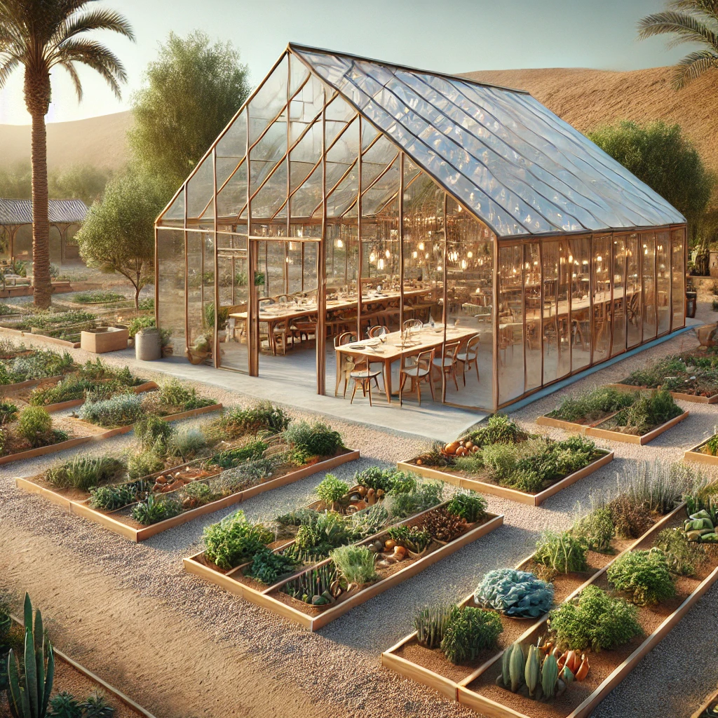 exterior shot allotment gardens centred around a communal area in an arid ecosystem
