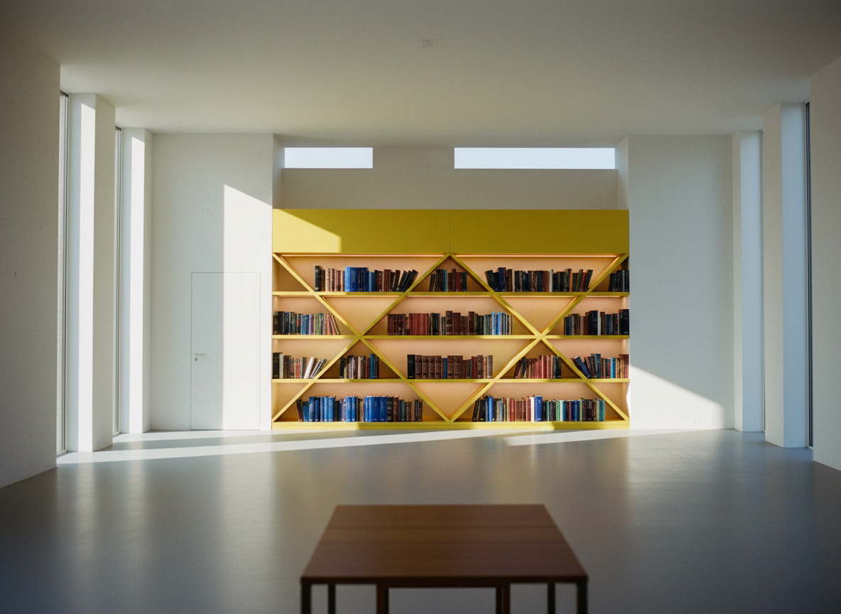 kengo kuma close up shot jewish chapel study and prayer room with nice artificial lighting featuring the bookcase shown in the render keep the room without windows architecture