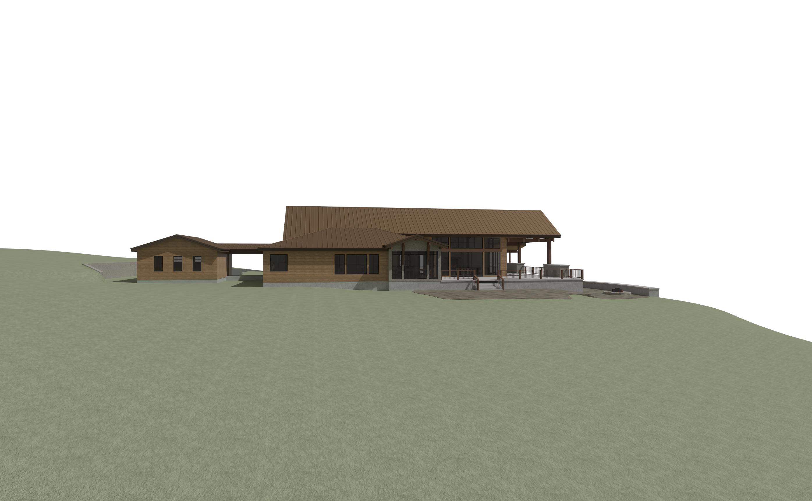 strict mode this is a texture and lighting enhancement only any change to geometry materials or layout is incorrect geometry lock absolute do not modify any windows or doors do not change mullions grids or window line patterns do not resize replace move or redesign windows or doors do not add or remove openings do not add elements no fireplaces trim changes or features keep rooflines walls corbels and structure exactly the same if there is any uncertainty copy the original exactly material lock critical material locations must remain exactly the same areas that are rock must remain rock areas that are siding must remain siding do not convert rock to siding or siding to rock do not expand or shrink material areas do not reinterpret material boundaries only improve realism of the existing materials texture depth shadows anti failsafe very important do not simplify or clean up window designs do not alter or straighten window linework do not unify or balance materials do not replace detailed areas with simpler ones lighting render apply realistic natural lighting and shadows photorealistic material quality landscaping isolated from structure add subtle realistic landscaping only around the building do not interact with or modify the structure in any way add montana views and native vegetation hill slopes slightly up to the left and slopes down on the right only trees far off in distance mountains far off in distance the mountains are the bitteroot mountains final rule preserve all geometry all window details and all material locations exactly enhance realism only
