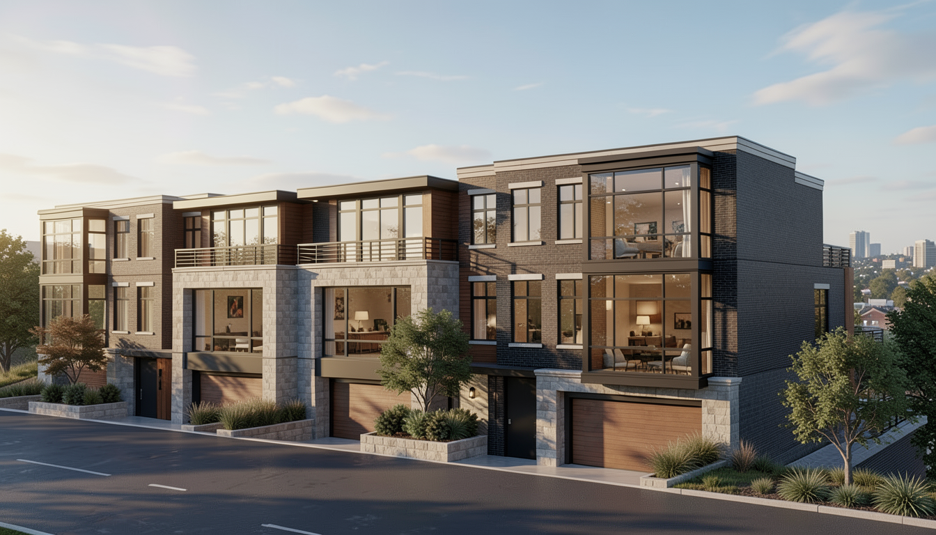 modernist exterior shot render this 3d model as follows roof timberline hdz charcoal soffit and fascia black aluminum black windows and trim cedartone woodlook garage doors and front entry doors fon du lac charcoal country veneer stone in yellow areas board and batten lp smartside in sw 7062 rock bottom color in green areas lp smartside lap siding in sw7062 rock bottom color in blue areas retaining wall to left of garage in chilton wallstone architecture