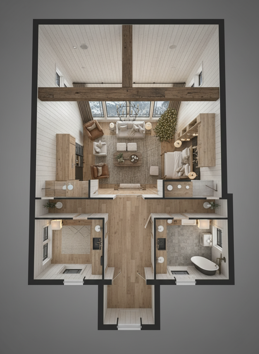 light the interior like a cloudy day transform your bathroom design photo into a hyper realistic architectural visualization of a contemporary modern bathroom preserve the exact geometry layout proportions and materials of the original design lighting create an atmosphere of soft cloudy daylight reminiscent of a cloudy rainy day without visible rain with diffused natural light maintain balanced contrast avoiding harsh shadows and highlights materials and textures enhance the realism of materials micro details surface imperfections soft reflections precise roughness and a physically correct response to light highlight textures light walnut wood grain light beige tiles metal and matte finishes high micro contrast and tangible depth the color of the fixtures and shower enclosure is gray the mirror reveals the tiled wall and smooth white door a white countertop under the sink two round wall lamps to the right of the mirror with the light on led lighting behind the mirror rendering style ultra photorealistic architectural visualization cinematic quality natural color grading neutral tones soft highlights realistic global illumination physically based rendering high dynamic range premium interior photography camera and composition wide angle architectural lens natural perspective eye level view deep focus sharp details throughout the frame natural framing no distortion ambience calm elegant contemporary upscale residential atmosphere clean minimalist sophisticated and free from visual noise output 8k resolution ultra detailed noise free sharp edges professional quality architectural rendering white sockets no additional led lighting negative cues no raindrops lens flare fog haze blur cartoonishness styling over sharpening artificial glare unrealistic reflections distortion clutter led lighting windows concrete led lighting in cabinets