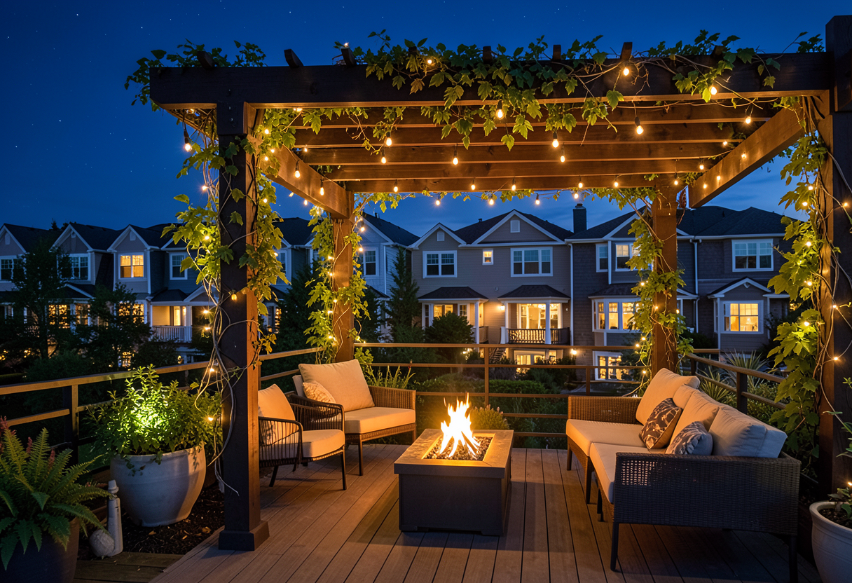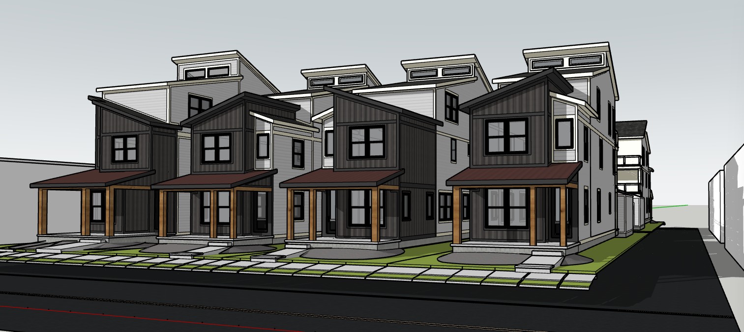 urban context single family row houses keep geometry colors and materials unchanged dark grey board and batten trim with white siding and trim beyond and add some low landscaping midday sun