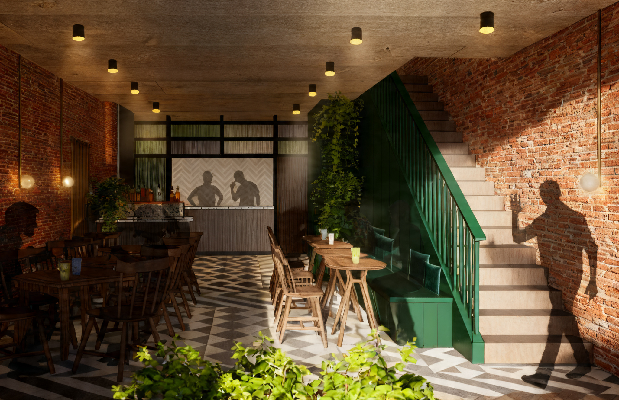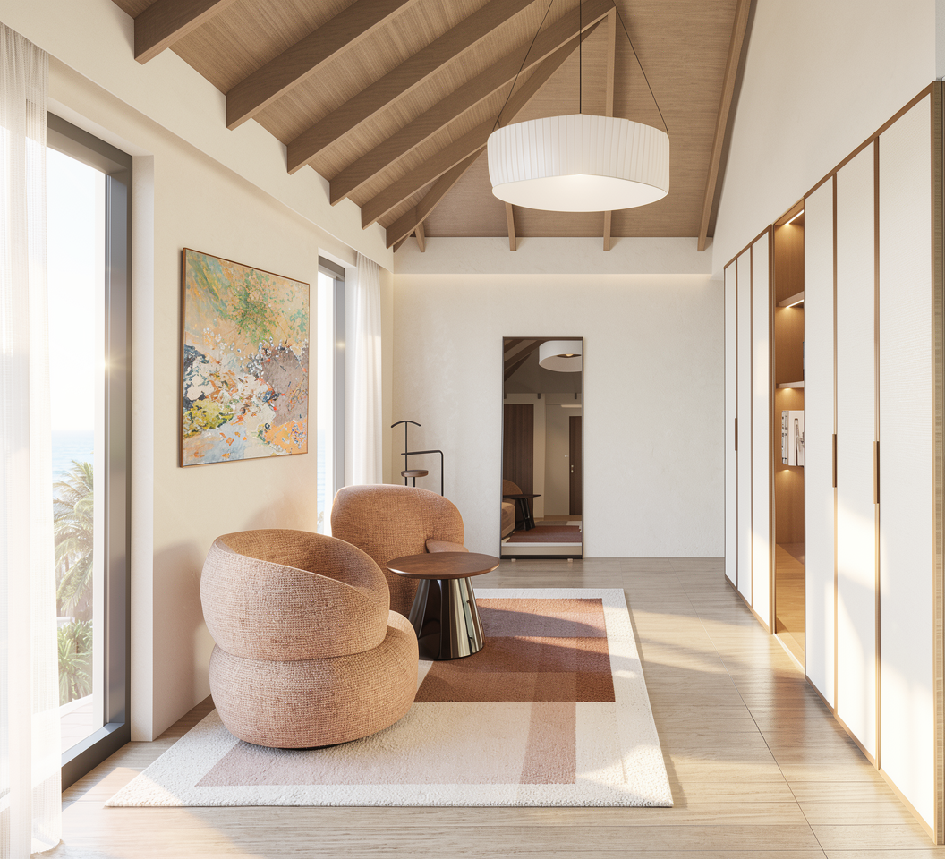 a cozy modern room with a wooden floor and a comfortable atmosphere the wall panels and large cabinet doors are painted in soft gray the shelves are filled with books in lighter color and sculptoral shapes and have a warm wooden texture ther is not lights inside the shelves a dark blue sofa with decorative pillows in various shades of gray and blue sits beside a small round white side table the floor is accented by a light gray textured rug ambient lighting provides a warm and inviting glow creating a serene and peaceful environment add some natural lighting coming from the left side