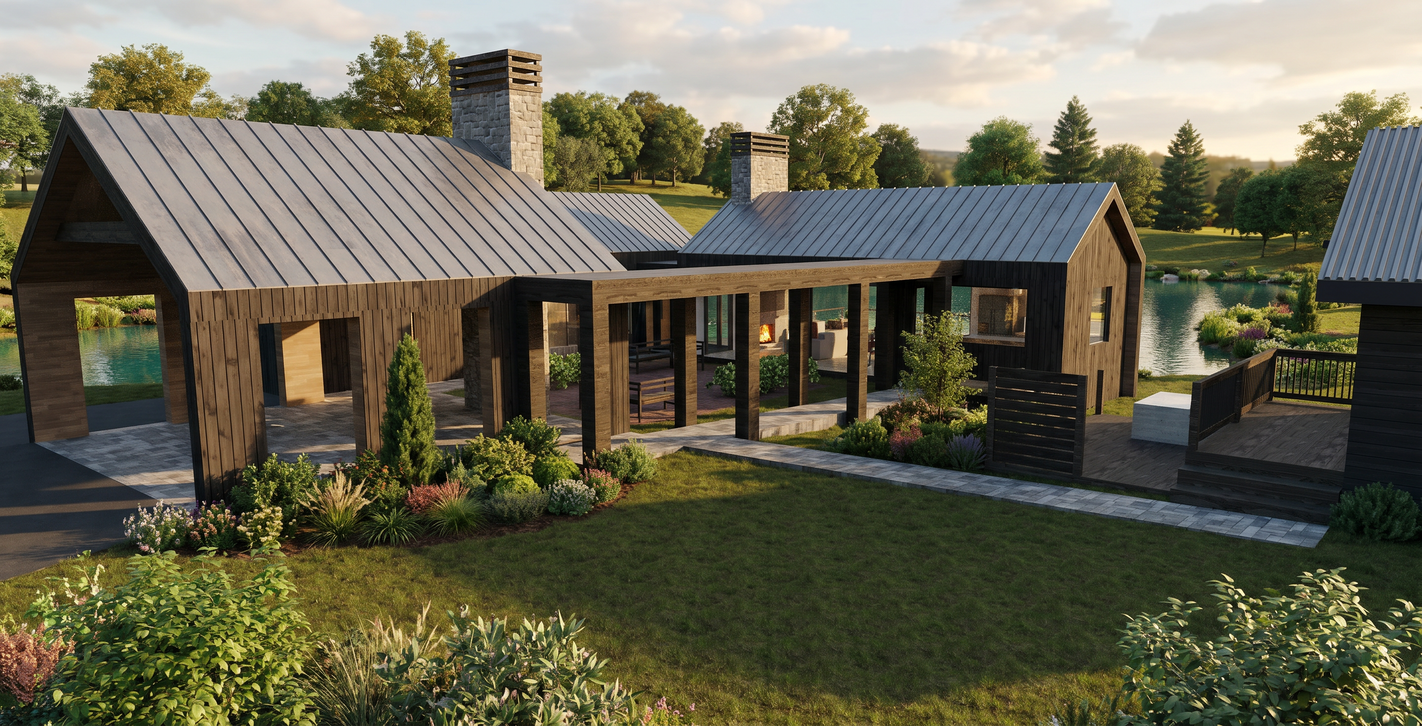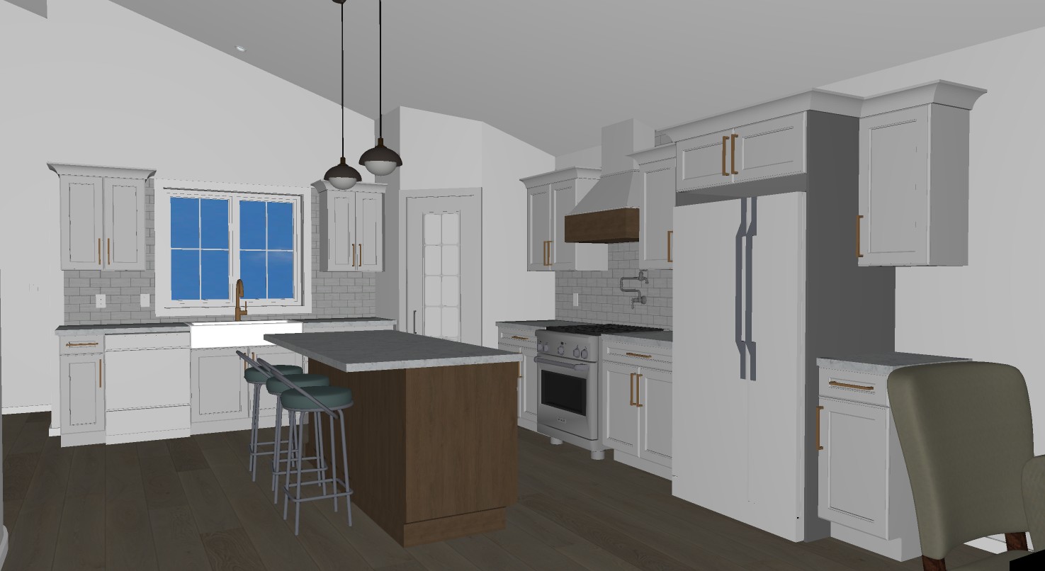 add stainless appliances change island a brown maple texture with little woodgrain add the same woodgrain to the bottom of the rangehood add counter decoration make the rangehood top white create a woodgrain band around the bottom of the rangehood change the barstool frames to brass and the pads to brown leather add a grey tone to the floor keep the perimeter cabinets at white change the dishwasher to stainless steel add a trim around the bottom of the island add counter decoration