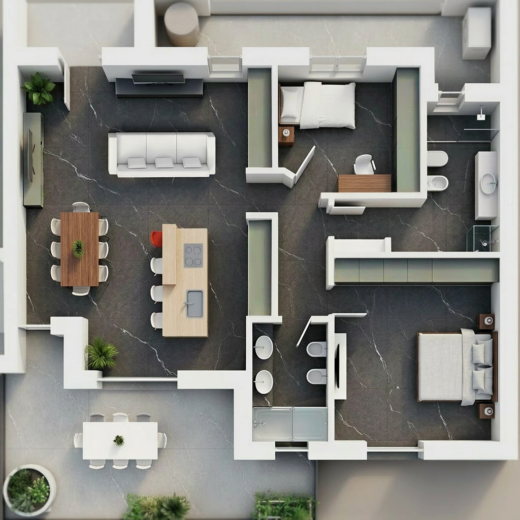 convert this floor plan into a realistic isometric 3d view of a full house show the space from an elevated angle with furniture walls and details visible minimalsitc keep floor material keep furniture improve sofa perspective use the same furniture as shows on the plan do not change the orientation of the floorplan