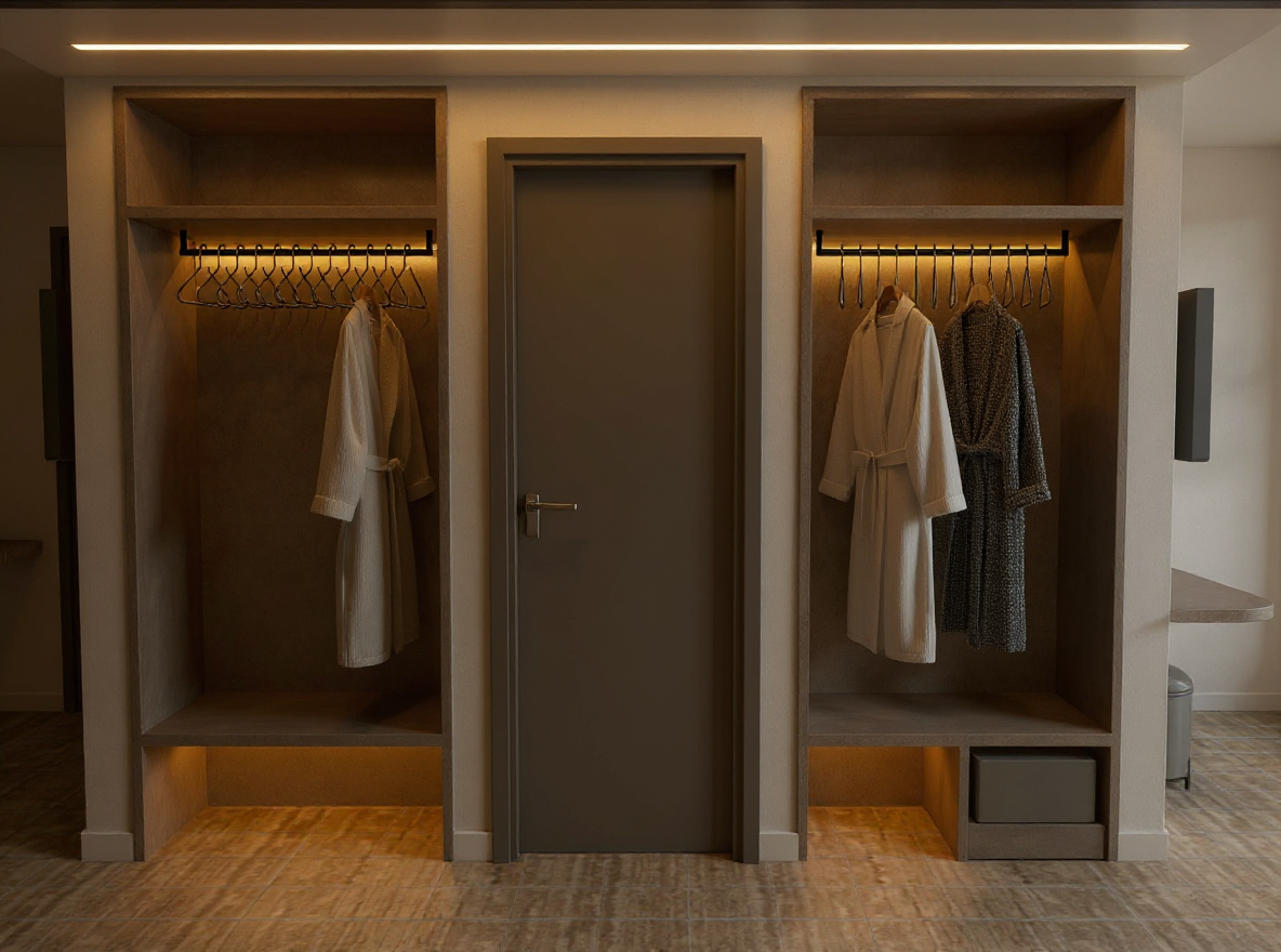 high quality travertine floor matte lights on led light linear above hangers render towels and two bathrobes