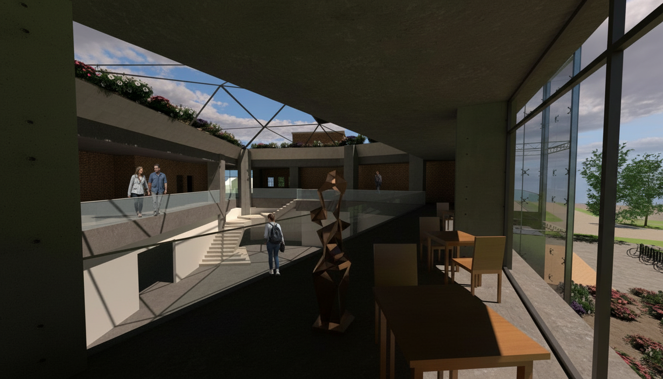 interior gallery scene in a cultural center use the existing model and materials exactly as provided do not add or remove any walls do not alter the right side of the corridor do not change the stair or guardrails do not place any new light fixtures or light sources use only the current environment light and any lights already present in the file white plaster walls with a subtle eggshell finish warm oak plank floor with gentle gloss framed artworks along both walls at eye level with consistent spacing and crisp shadow gaps as they appear in the model a single statement sculpture beside the stair on a low plinth as modeled ceiling is a clean plane as modeled people of diverse ages and attire walking naturally several visitors paused and leaning slightly forward to study the art a couple gesturing quietly one person taking notes camera at human eye level near the corridor center focal length around thirty five millimeters brighten exposure and lift midtones so the art is clearly visible while keeping highlights controlled white balance warm neutral around thirty six hundred kelvin for a welcoming feel realistic global illumination with gentle contact shadows at baseboards and around the plinth depth of field subtle and natural overall mood welcoming refined contemporary strict constraint do not modify geometry do not add partitions do not add lights render only with existing lighting and environment