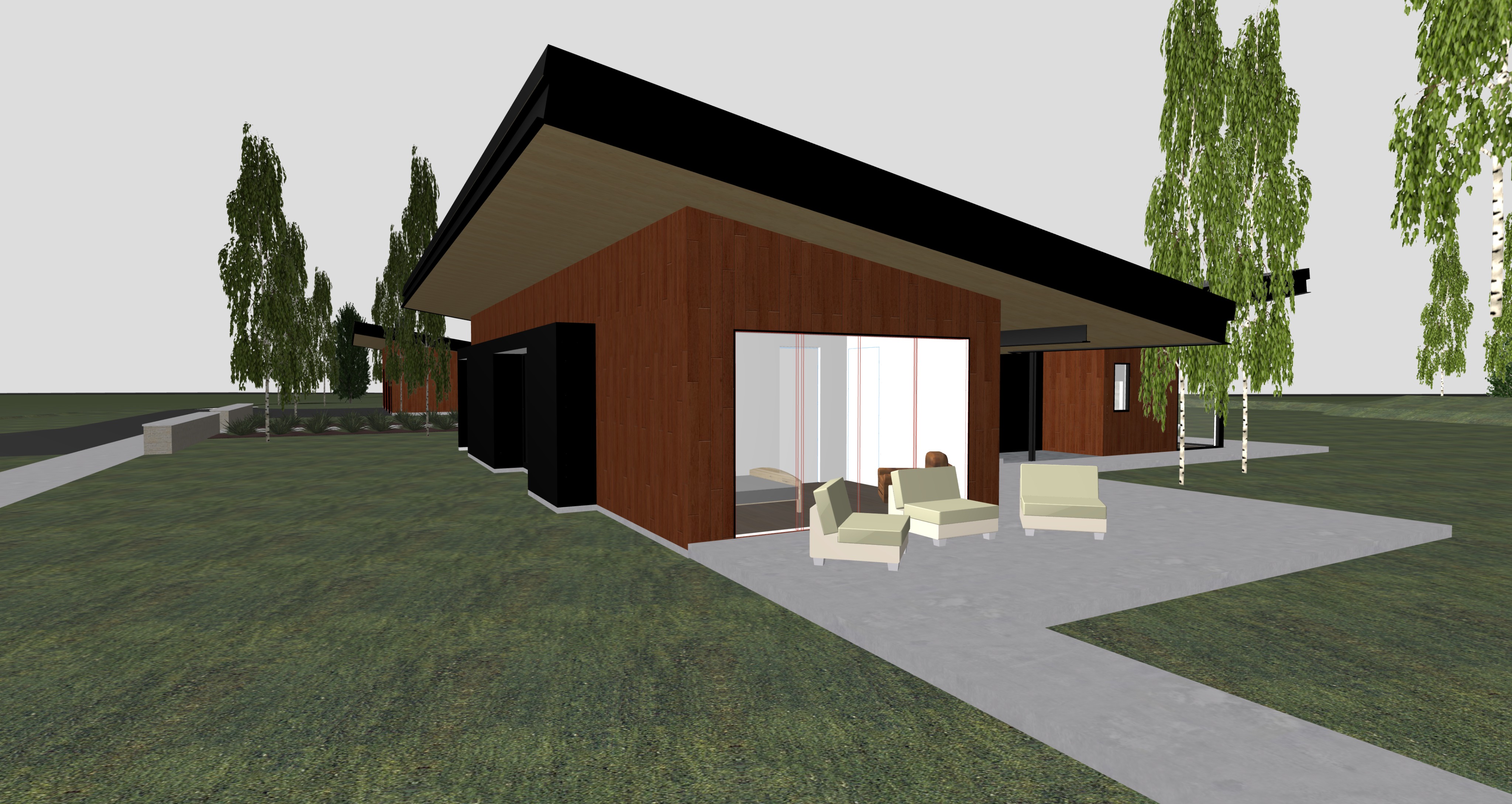 high mountain range in background grass in green areas aspen trees pines refined furniture on patio bushes and plants next to edges of building