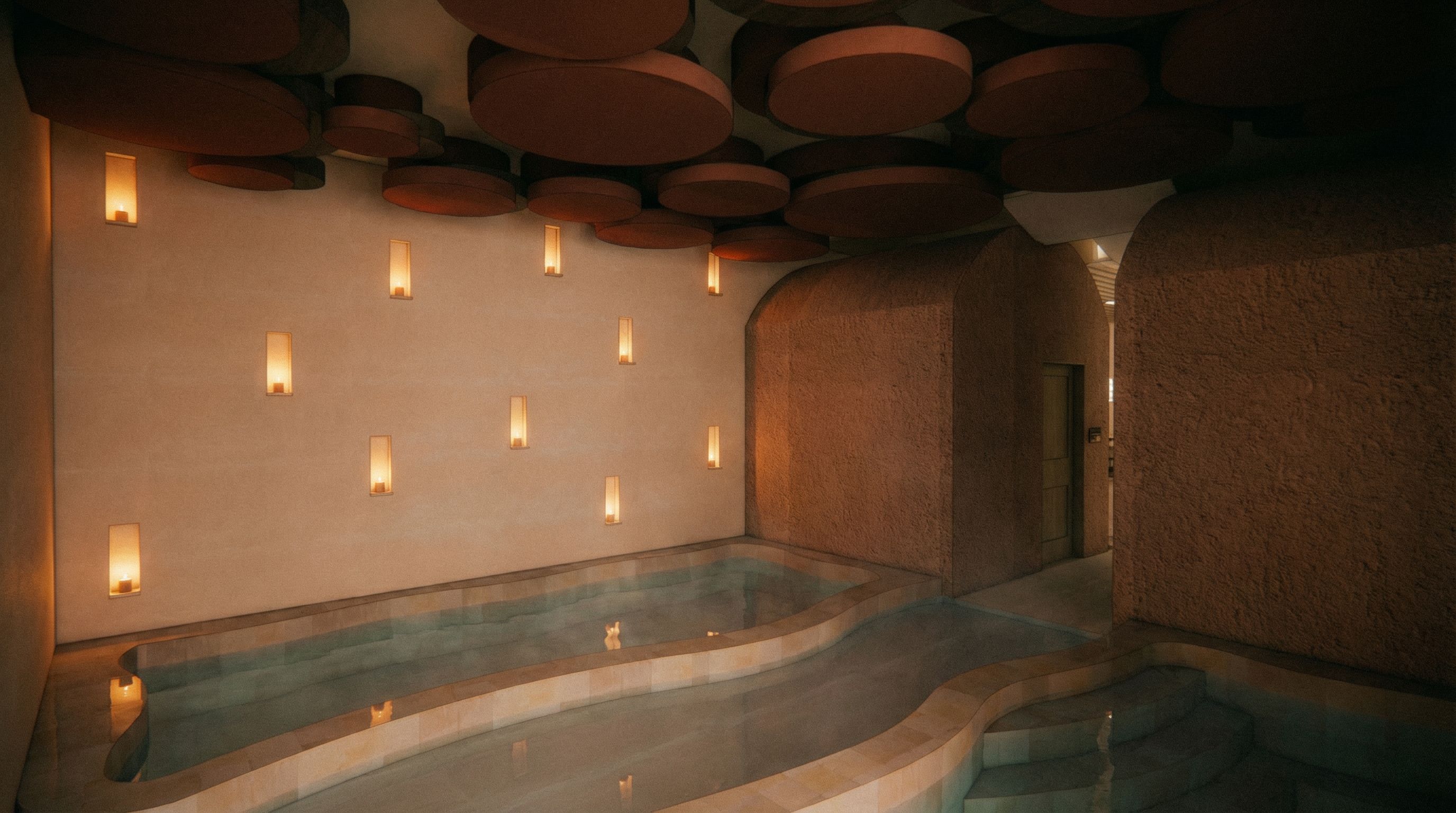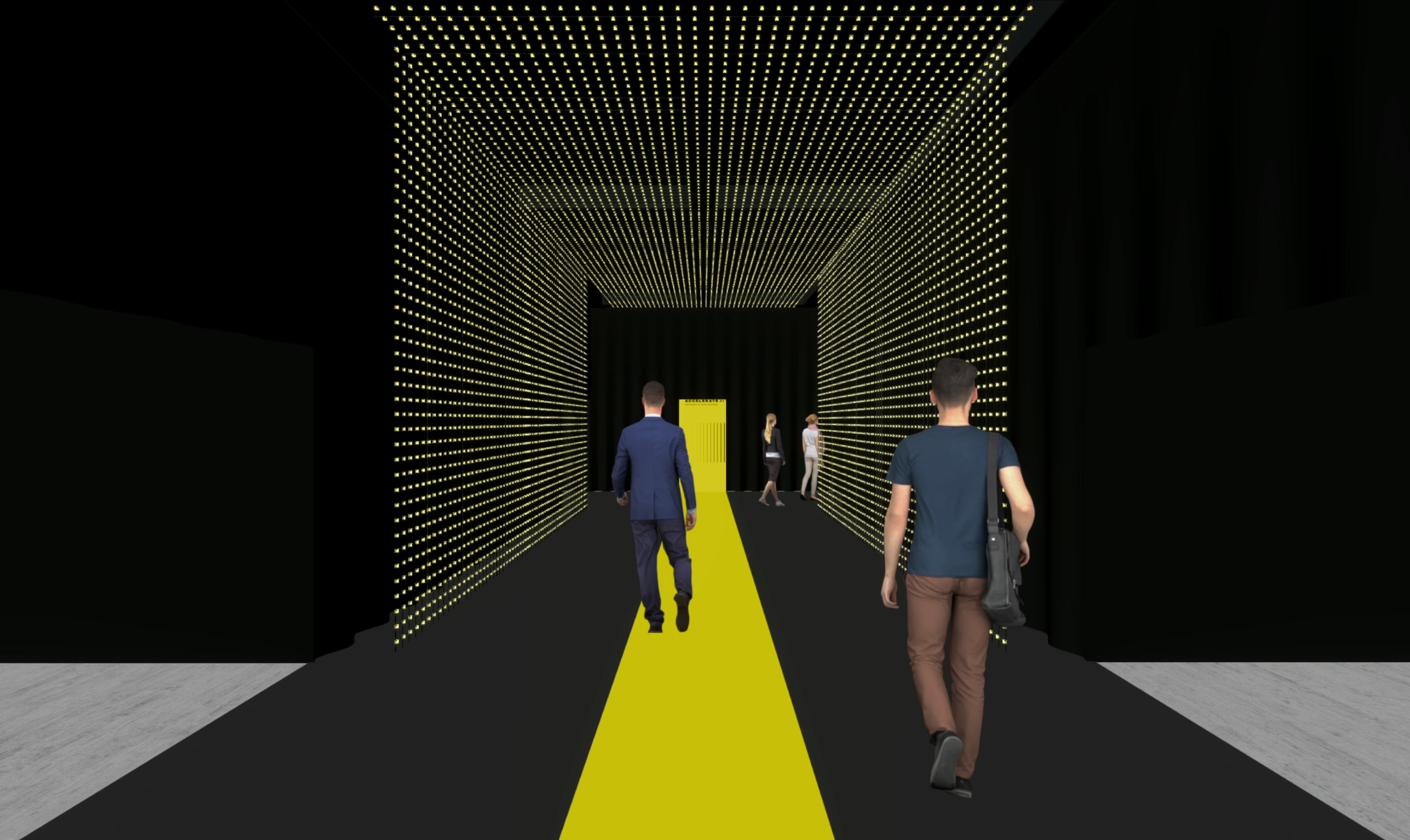 realistic dark entry tunnel to expo environment w soft yellow lighting add business people walking toward the end of tunnel black carpet floor with yellow carpet strip