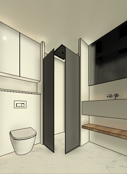 a photorealistic high end contemporary shower room featuring large 120cm x 60cm light earth toned porcelain tiles on both walls and floors the room includes sleek white ceramic sanitary fittings and a modern cabinet above the wc above the washbasin there is a large mirror with integrated led backlighting all hardware including the mixers and cistern buttons is finished in polished chrome the ceiling features minimalist recessed spotlights the atmosphere is spa like clean and bright with added chrome accessories like a minimalist robe hook