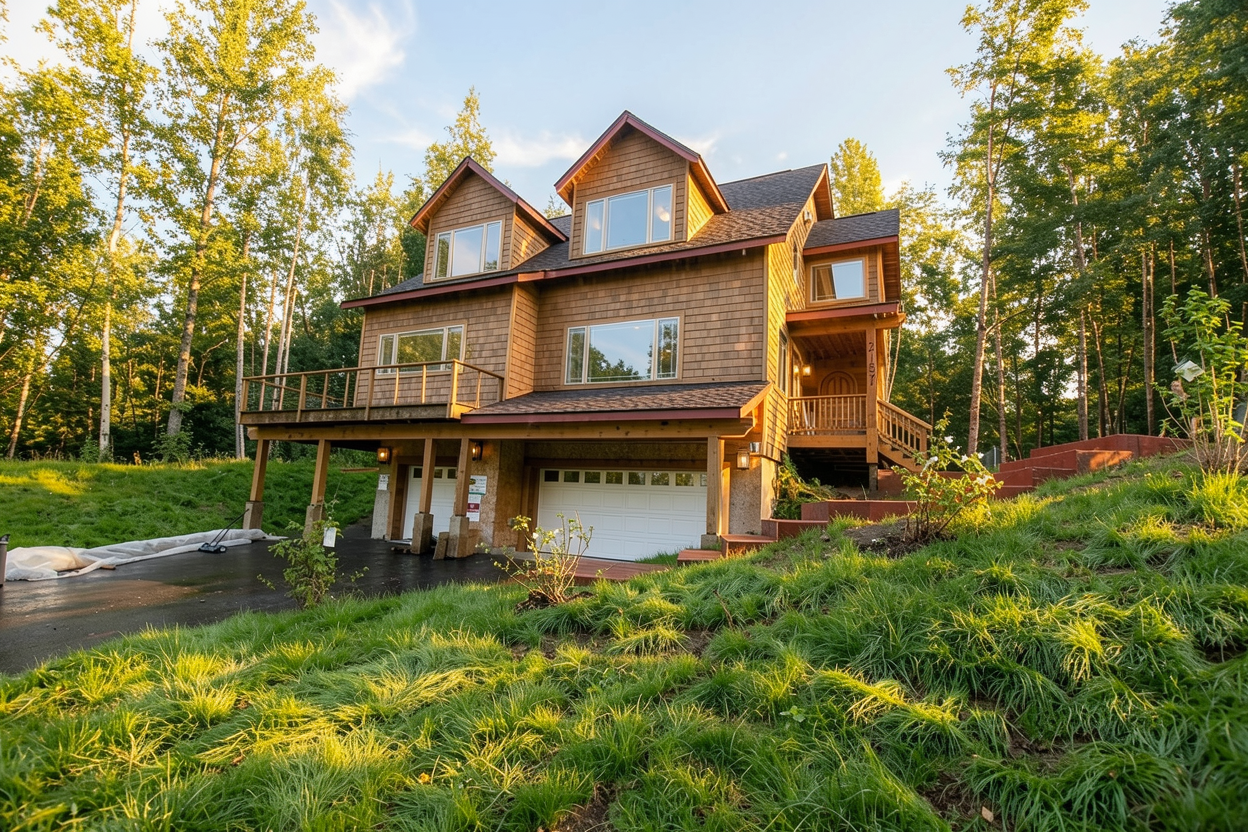 nouveau commerce a mont tremblant village qc revetement rouge sang de boeuf moulures blanc creme toit au 2e tage en bardeau d asphalte noir 2 tons village et arbres l arri re gazon et arbustes tout autour vue de face