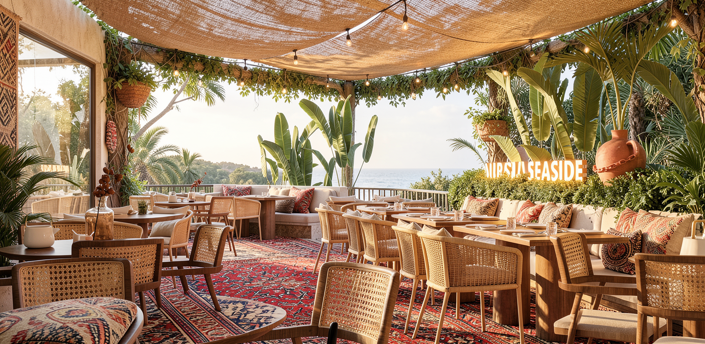 bohemian concept open air restaurant with ethnic patterns regional rug on the floor and an open ceiling