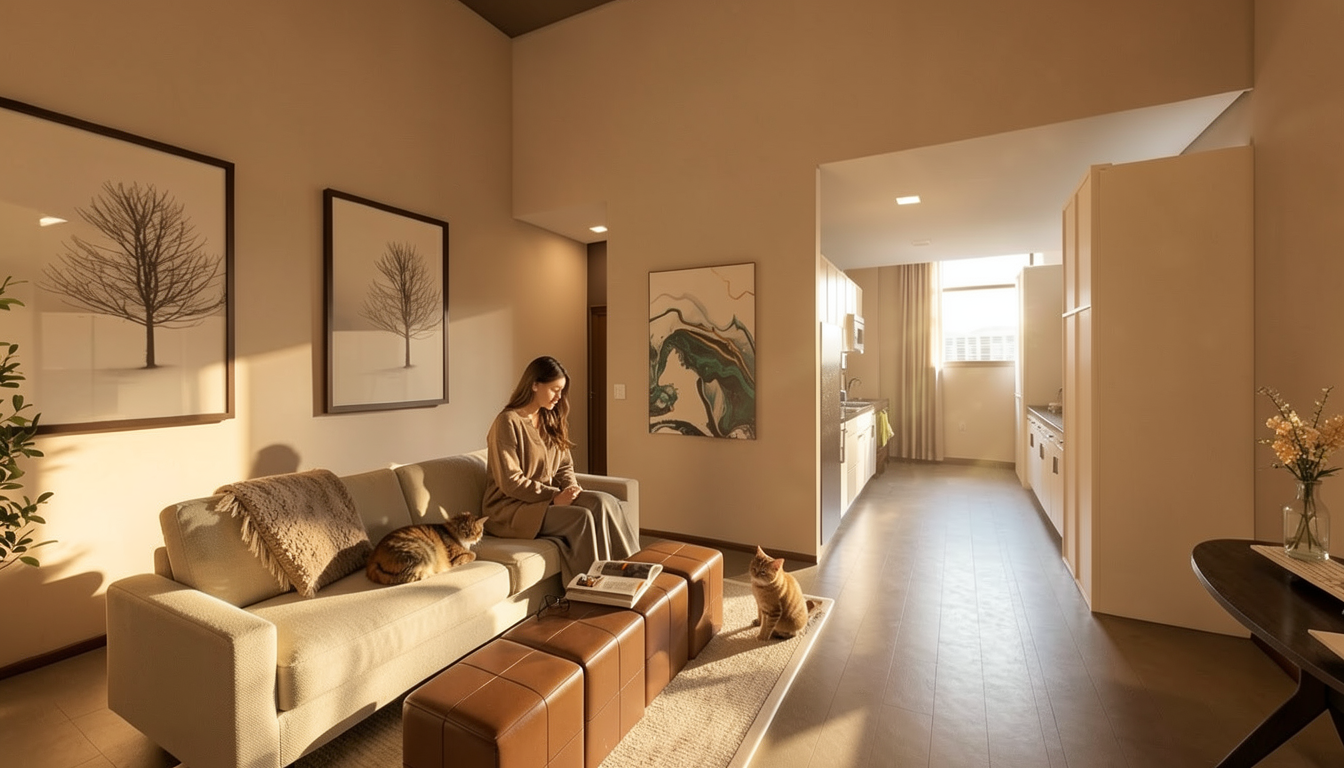 warm aesthetic with high end decor person walking to other room with cat