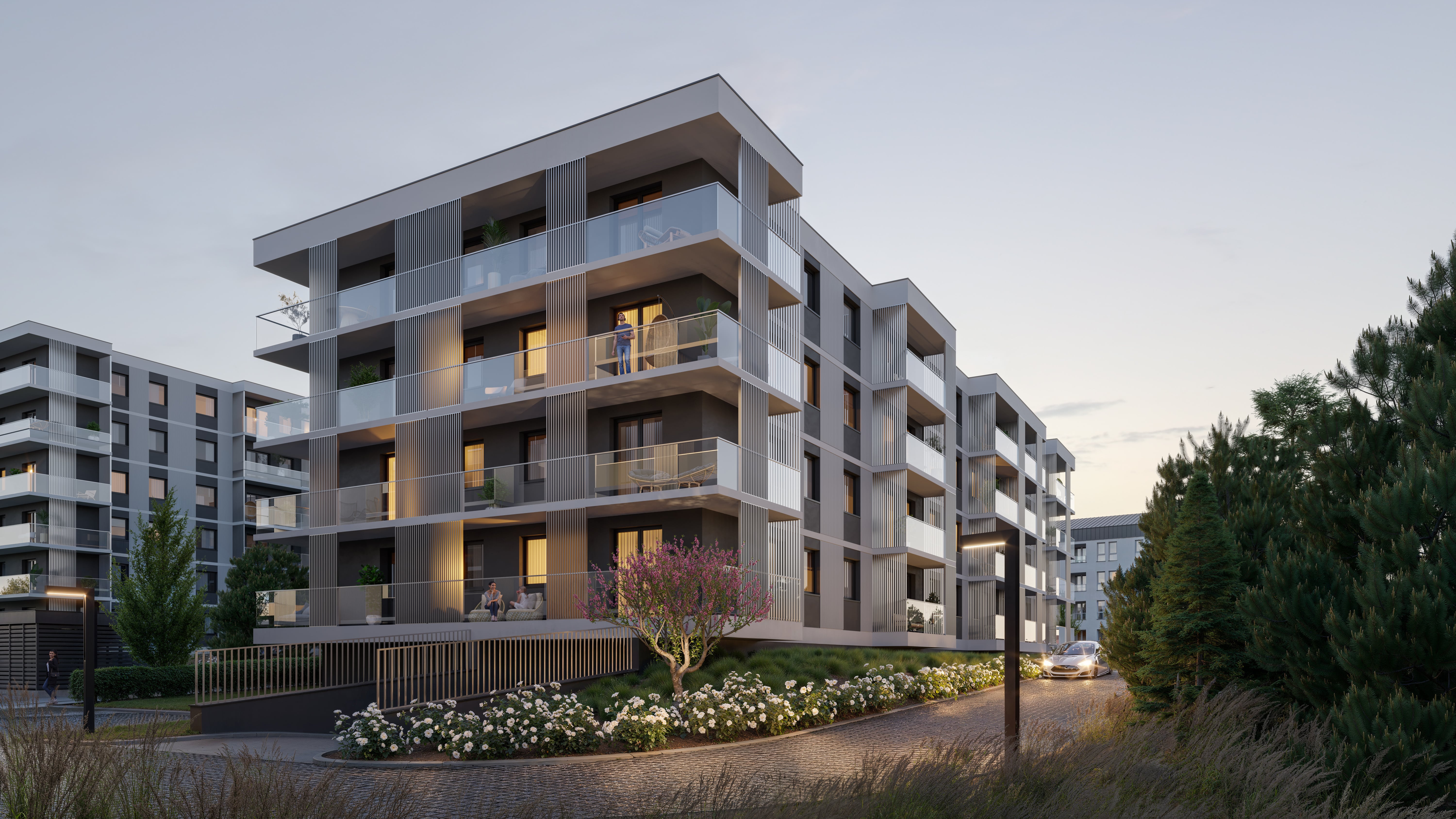 transform the scene into a cinematic evening lifestyle moment while keeping the exact architecture and building structure unchanged modern residential building at blue hour just after sunset warm lights glowing from apartments and balconies people visible on balconies talking and relaxing a couple walking along the path in front of the building a child riding a small scooter along the sidewalk soft wind moving trees and plants in the landscaped garden a car slowly entering the driveway with headlights illuminating the path camera movement slow cinematic drone shot starting low near the garden and rising smoothly upward revealing the illuminated facade of the building lighting soft evening ambient light warm interior lights subtle reflections on glass balconies atmosphere calm premium residential lifestyle modern european apartment complex highly realistic architectural visualization ultra realistic cinematic real estate promotional video shot