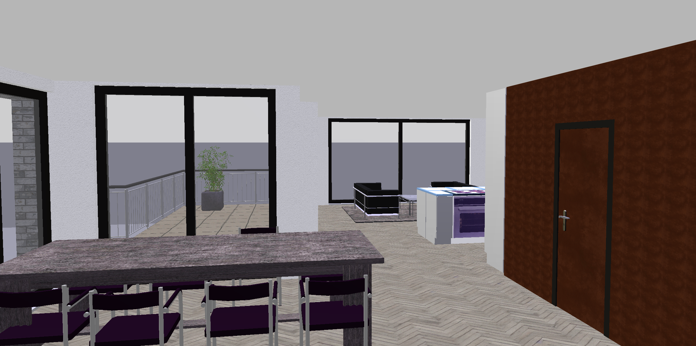 genau dieses rendering berarbeiten fotorealistisches innenraum foto exakt dieselbe perspektive und kameraposition wie das hochgeladene referenzbild 100 identische raumgeometrie exakt gleiche m belanordnung exakt gleiche verlegeart und richtung von parket wie vorlage exakt identische fensterpositionen mit gleichem ausblick auf den z richsee 40 meter tiefer durch die fenster weiches nat rliches tageslicht leicht schr g einfallende sonne durch die grossen fenster geschlossene r ume k nstlich ausleuchten sanfte realistische schatten blickrichtung ist nach s den sonnenlicht kommt von westen realistische materialien echte holztexturen stoff mit leichten gebrauchsspuren hochwertige oberfl chenreflexionen fensterrahmen dunkelbraun kleine gr npflanzen tisch oval mit marmor collemandina grigio in braungrau dunkel esstischleuchte fendi crystal light k che edelstahl schrankfronten auf rechter seite alles grauglas matt grifflos t re fl chenb ndig grauglas matt parket ruhig und hellgrau alle sichtbaren w nde sind sichtbeton mit modernen leichten vorh ngen in graubeige runde filigrane schwarze einbauspots vor den fensterfronten sehr moderner minimalistischer look nat rliche farbwiedergabe golden hour feeling das bild muss wie eine professionelle fotografie aussehen es soll ein echtes und reales foto sein canon eos r5 35 mm festbrennweite f 2 8 hyperrealistisch dslr qualit t raw aufnahme 8k aufl sung extrem scharf perfekte tiefensch rfe professionelle architekturfotografie