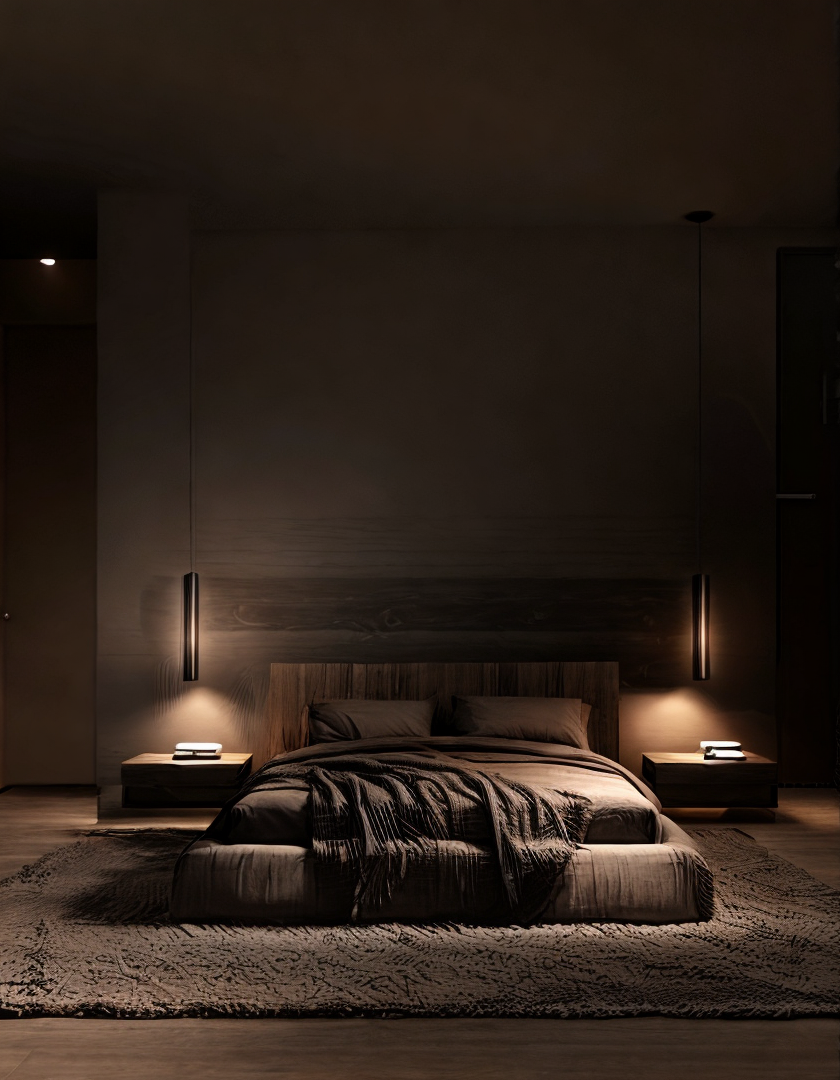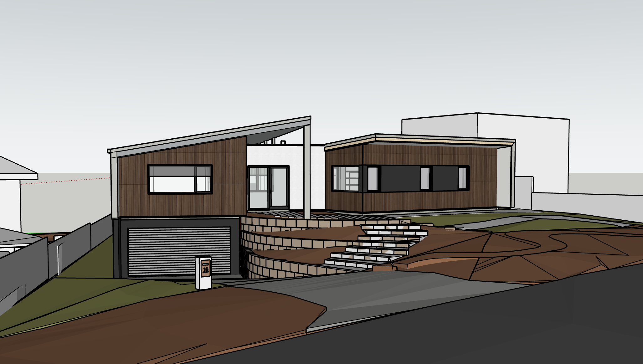 ultra realistic modern external shot of a house with timber cladding limestone block wall to front retaining make the sky with the sun setting behind the house add landscaping plants and a tree to the right
