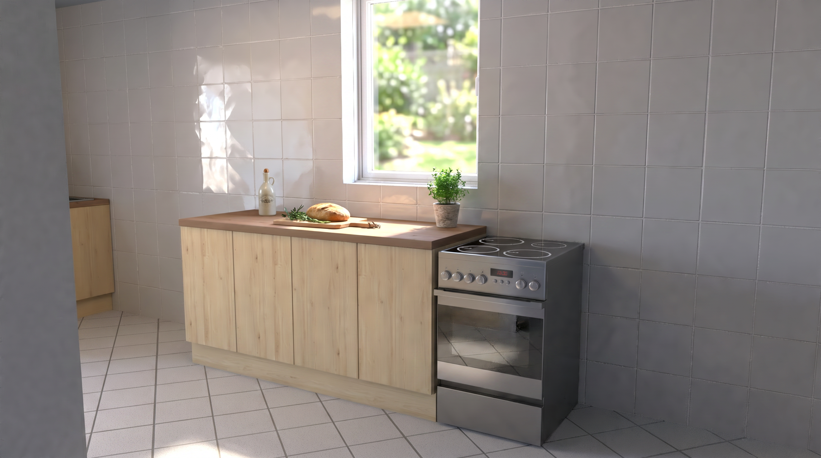 photorealistic modern mediterranean apartment building preserve original architecture preserve original colors and materials clean white plaster facade dark metal balcony railings matte black realistic glass reflections inland coastal croatian karst landscape building not on a cliff no steep drop no dramatic rocks sea far in the distance subtle sea view on horizon rocky terrain dry grass olive trees mediterranean shrubs natural stone walls minimal landscaping warm golden hour sunlight soft shadows high detail architectural visualization no material changes no color changes no redesign no visible sea dalmatian karst landscape natural terrain low vegetation dry stone walls