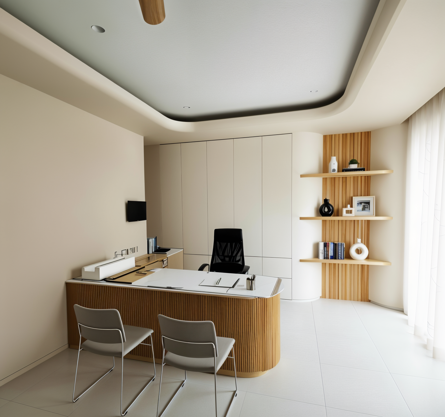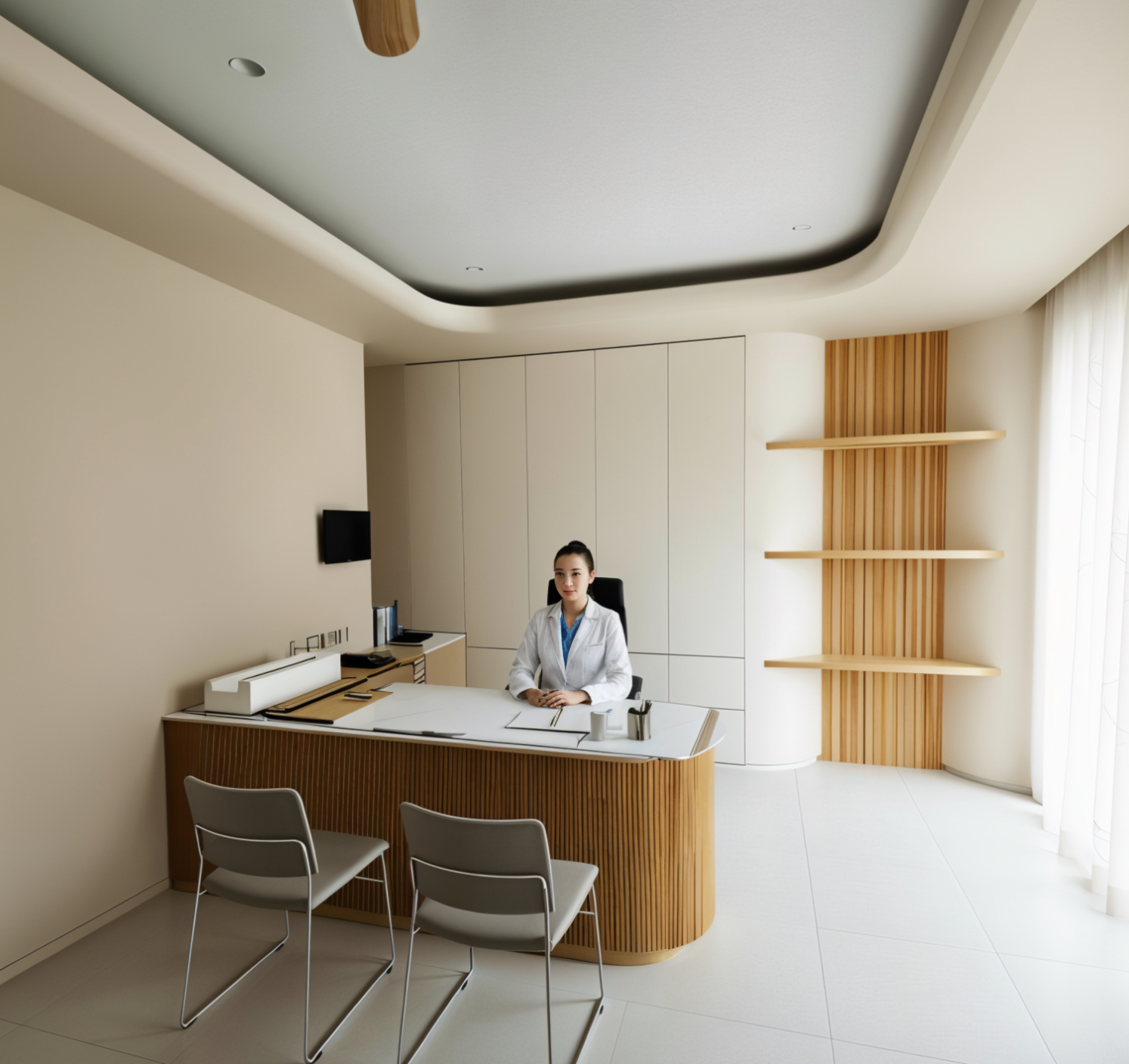 remove painting and remove stuff on top of desk place a girl doctor sitting on the chair place 2 visitor sitting on the chair