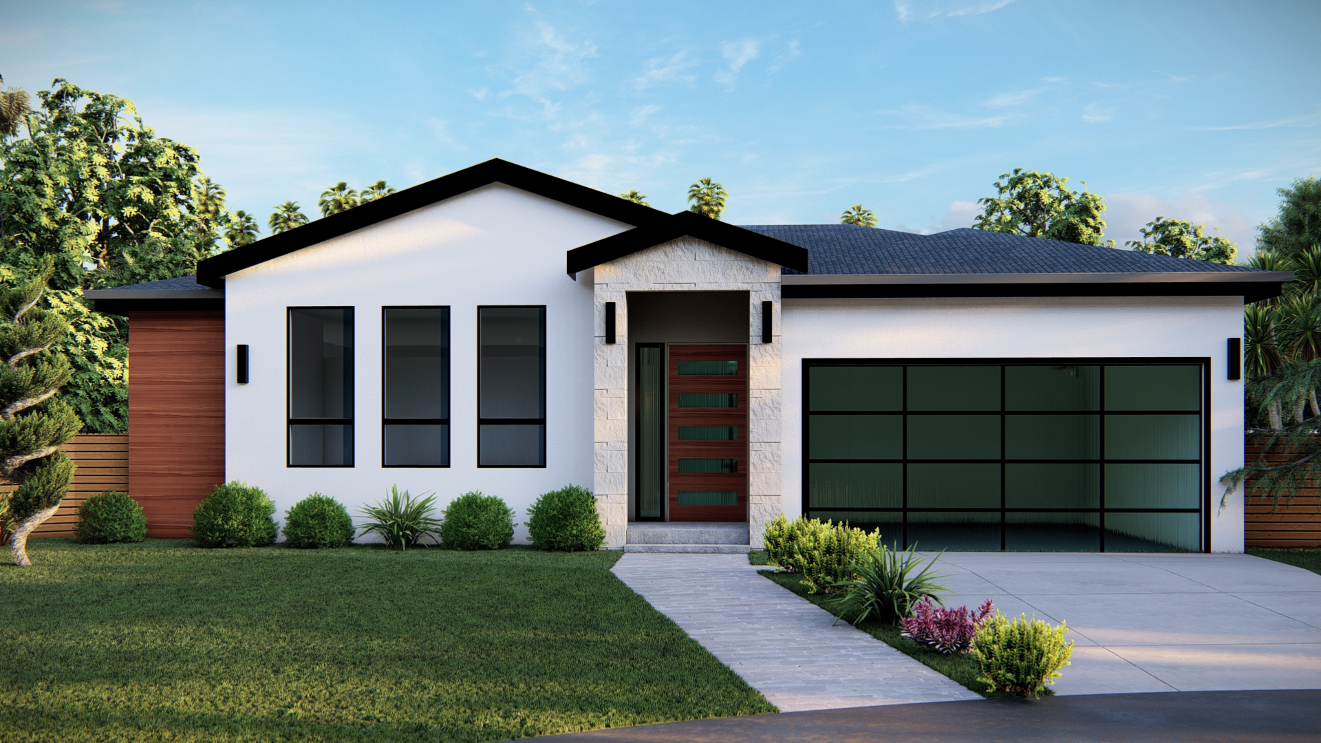 create a modern minimalist house exterior in a serene atmosphere the house features a sleek black roof and pristine white walls with vertical black framed windows the entrance is highlighted with light stone accents and a rich wooden door in a deep mahogany color the garage door is a smooth black blending seamlessly with the design surround the house with lush green grass and carefully manicured bushes in varying shades of green the sky is clear blue with soft white clouds complemented by the vibrant green of surrounding trees the scene is illuminated by warm natural sunlight enhancing the modern and inviting feel of the house