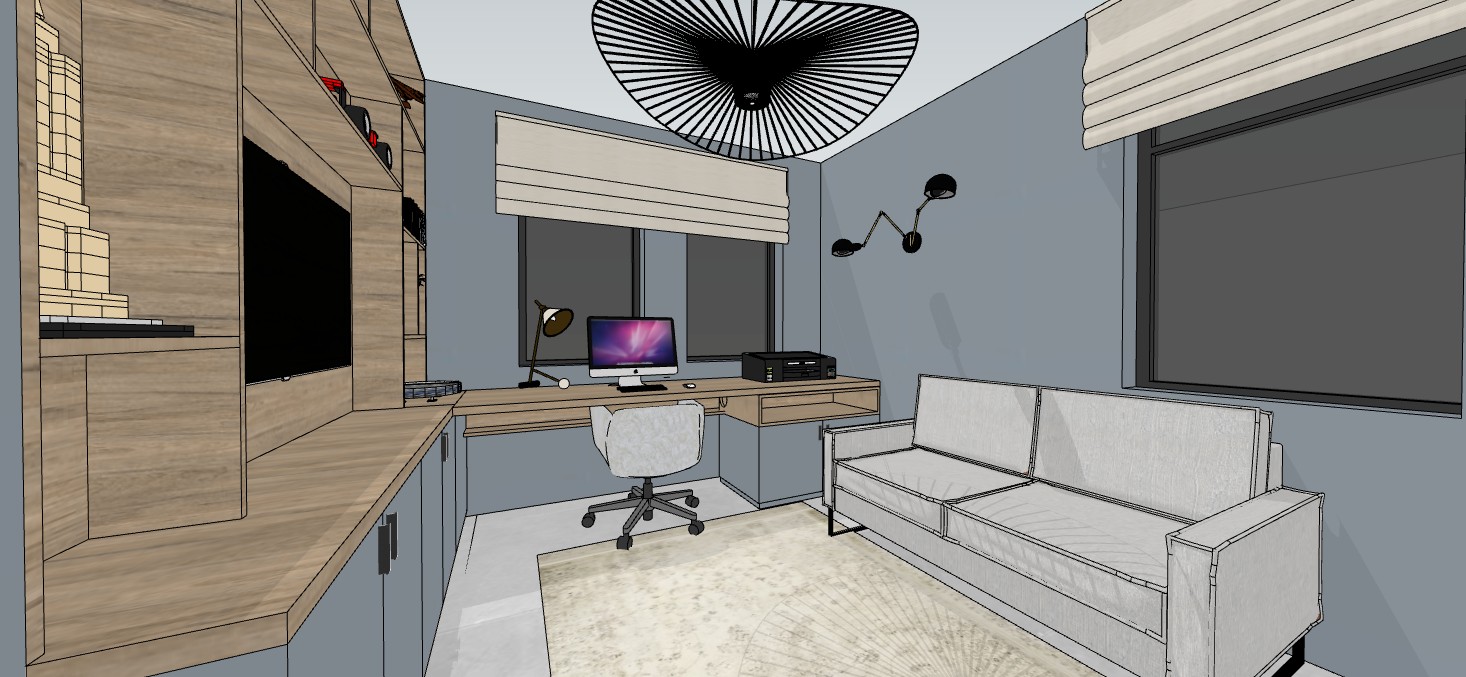 create a modern minimalist home office with a cozy atmosphere the walls are a soothing light blue the cabinetry and shelves are crafted from light wood adding warmth and texture the hanging light fixture is an elegant black geometric design the window features cream colored roman shades filtering in soft natural light the sofa is upholstered in light beige fabric complementing the soft neutral beige area rug design a sleek desk with a modern computer a printer and a black adjustable desk lamp the room feels serene and inviting perfect for productivity and relaxation