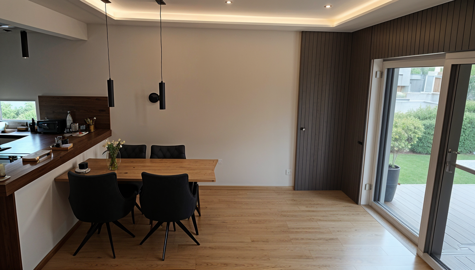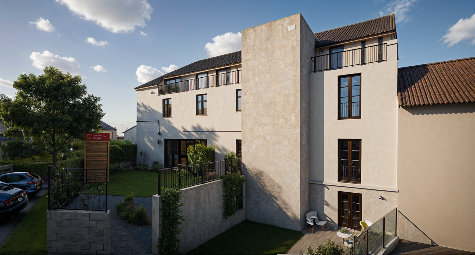 take the rendering and edit it precisely an outdoor sauna building in a garden featuring a natural stone facade larch wood roof and columns and a black metal attic trim the windows are mirrored and reflective with no visible frames or profiles frameless glazing scandinavian inspired architecture with clean lines minimalist design and natural materials color palette in neutral earth tones with warm wooden accents the atmosphere is cozy inviting and harmoniously integrated into the garden landscape with soft daylight natural shadows and surrounding plants grass and stone details withot any furnitures architecture
