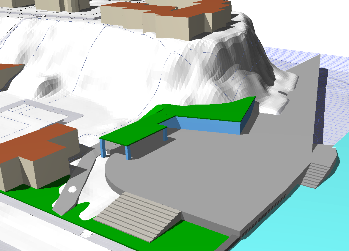 that is amazing can you make the massing diagrams look like colored jello the location is capitola california and the the project name is esplanade park please note that the roof tops intend to be live roof garden it is a single story stage structure as well as a public restroom and lifeguard storage area lots of trees with circulation near the stairs that lead to the beach