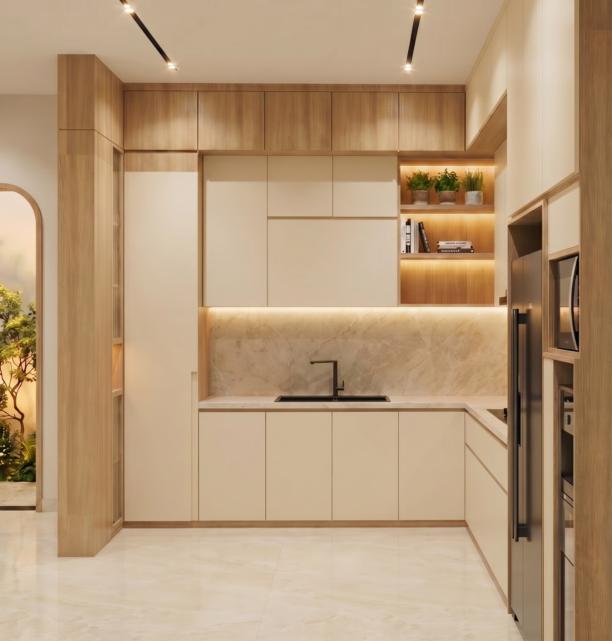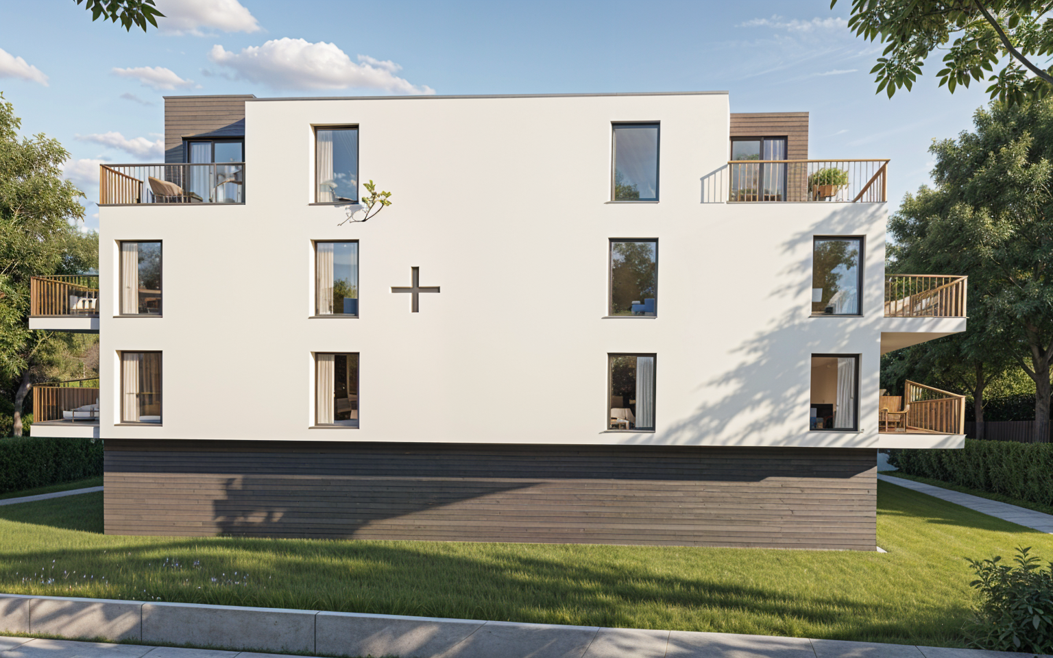 high end contemporary australian streetscape elevation render using the uploaded architectural elevation as the exact geometry and proportions reference keep the built form roofline wall openings garage opening handrail steps and fa ade composition exactly as drawn the house has a clean modern composition with a monument coloured custom orb metal roof matching monument gutter fascia barge and barge capping monument aluminium windows dowager grey rendered hebel power panel walls monument cladding panel above the garage door monument vertical castellated battens to the garage door and knotwood kwila aluminium cladding front entry door show realistic material texture subtle shadow lines crisp detailing and natural daylight present as a photorealistic architectural elevation straight on orthographic camera soft overcast lighting neutral sky realistic contrast premium residential finish no redesign no extra windows no altered proportions no landscaping obscuring the fa ade no people no cars no text no annotations no dimensions
