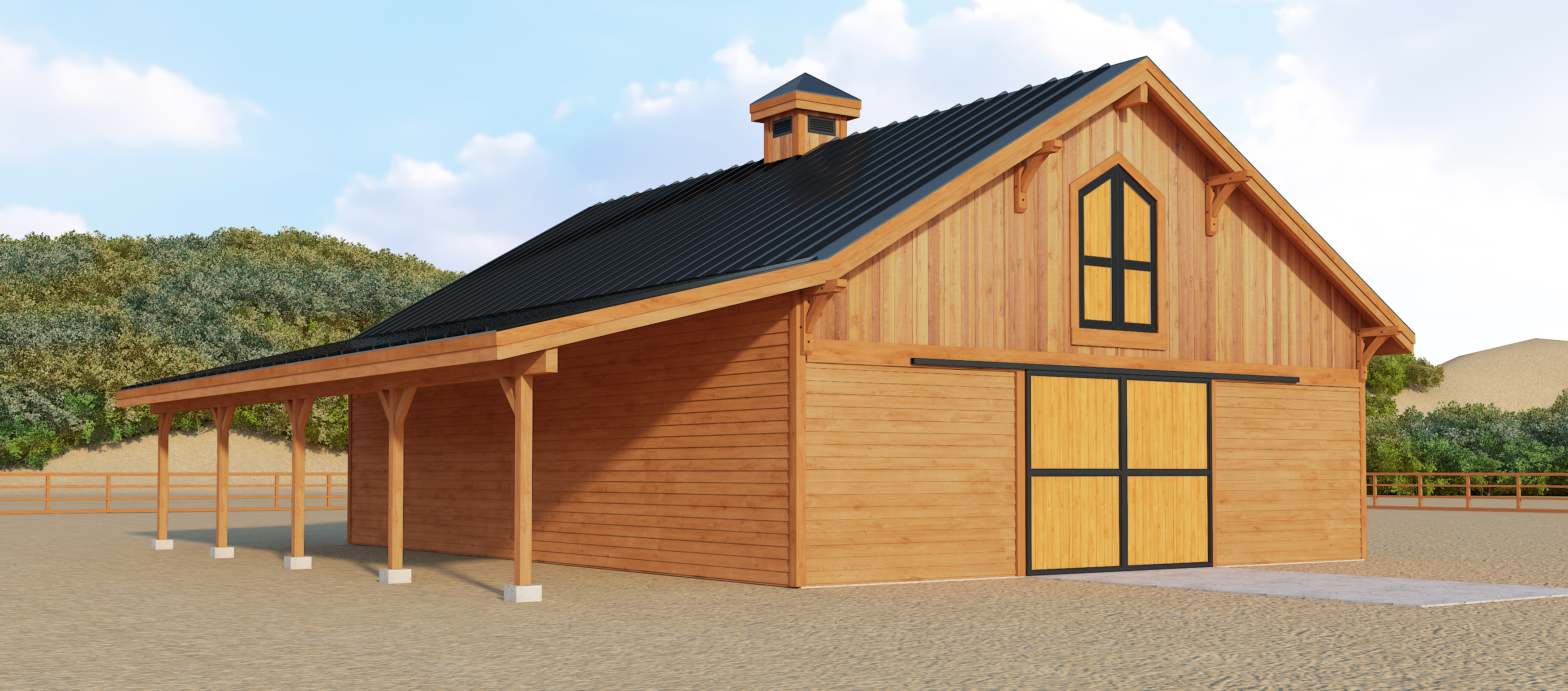timber clad architectural exterior rendered in cinematic bright natural daylight lighting beautiful clouds in the sky lush green grass on the ground natural light cedar wood siding with black trim wood barn doors with black trim black metal standing seam roof heavy forest area background lush green and dynamic vegetation landscape natural wood textures high fidelity photorealistic visualization crisp shadow falloff refined fa ade geometry richly detailed grain patterns less vibrancy and more detail on the wood soft atmospheric depth calm minimal landscaping premium architectural photography mood ultra clean composition and materials reduce vibrancy