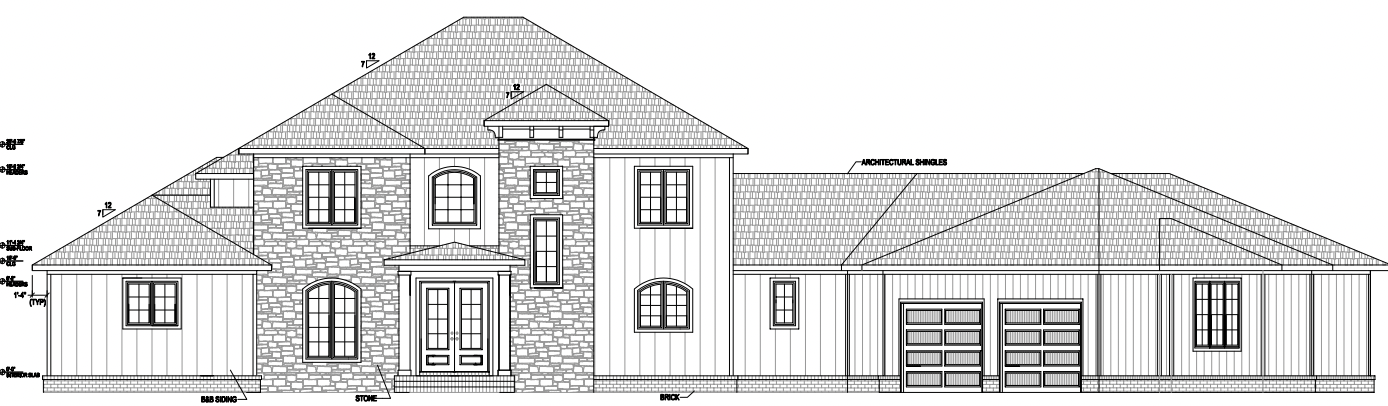 make this house off white with a grey black roof white windows and a pretty stone everywhere that is shown on the plan with some hardie board siding