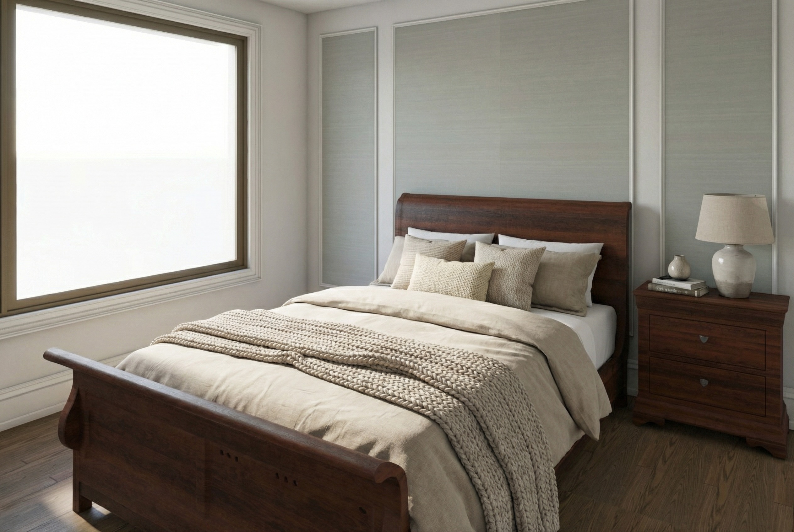 add a background greenery with a residential city view add beige curtains to window preserve colors