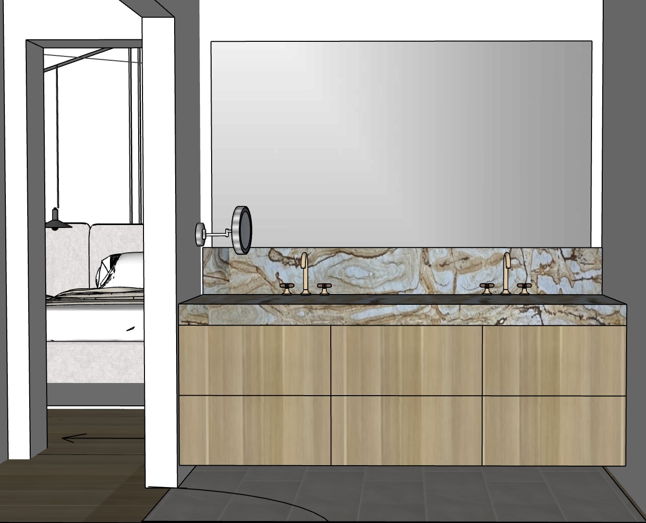 create photorealistic version of this vanity area with reflection in mirror led surrounding mirror add light wood pocket door opening left keep light grey tile floor in bathroom and light oak floors in closet and bedroom