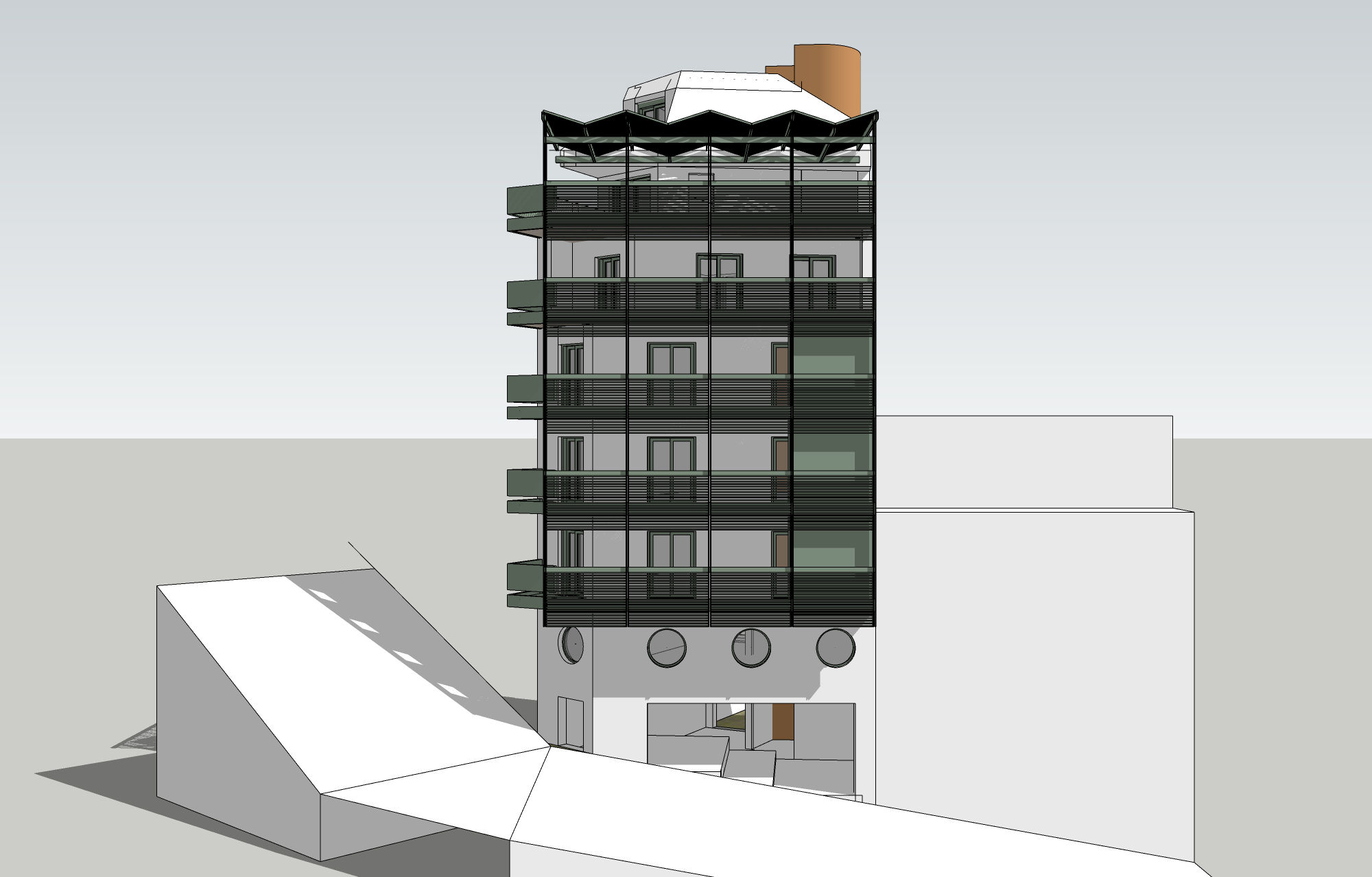 building with a metal mesh in front add greenery to balconies cars people and backrount contemporary and atmospheric feeling