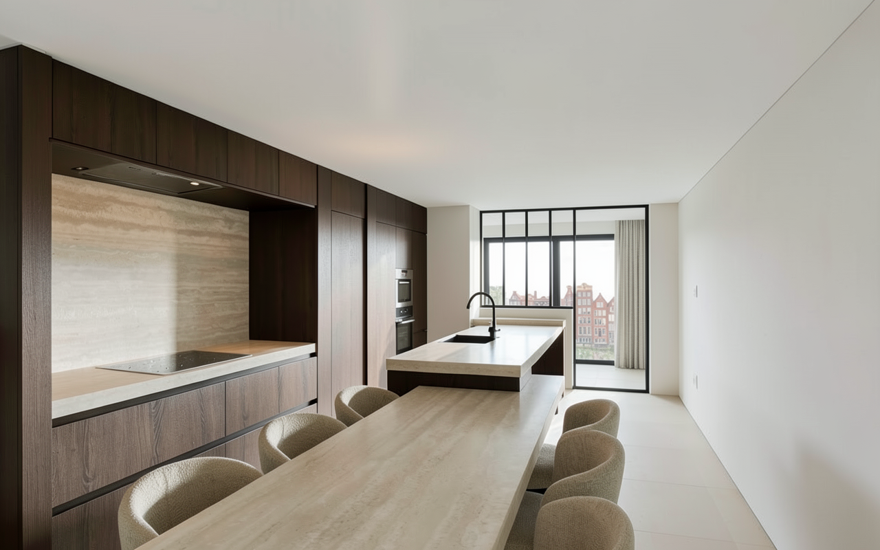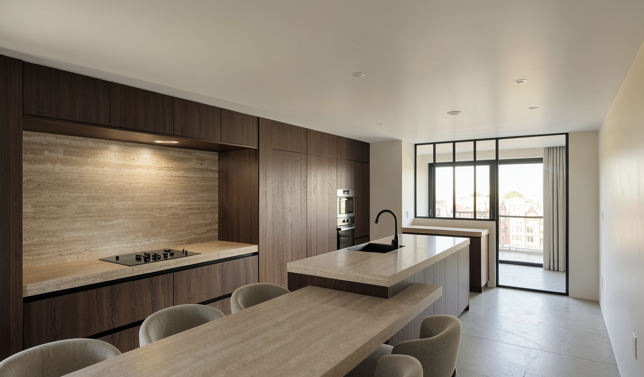 minimal modern japandi kitchen with dark brown oak doors and a travertine thick worktop and table