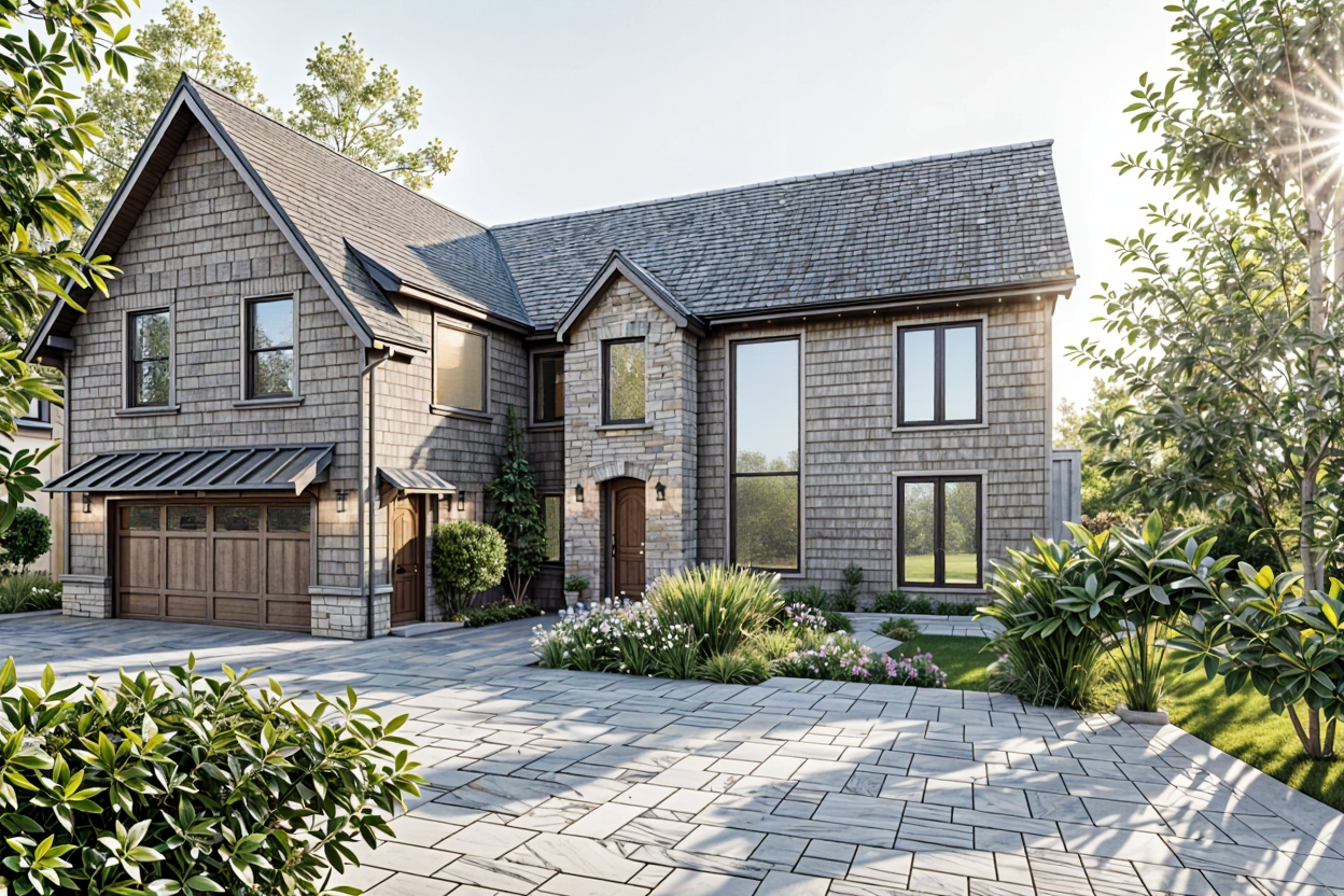 change all siding to a warm white finish but keep profile of cedars single siding maintain stone columns at entry charcoal grey trim on all windows keep window frames and sill in warm white to match siding all doors in dark charcoal grey with modern profiles add a vertical wood panel feature around the double height window on the right side of the house the wood should be smooth vertical slats with tight spacing in a soft grey brown natural tone the panel should extend slightly beyond the window edges and run full height from just above the foundation to the roofline keep all architecture window sizes and proportions exactly the same do not modify any other materials or areas of the house keep the design clean minimal and in a refined studio mcgee style no changes to architecture enhance details for presentation