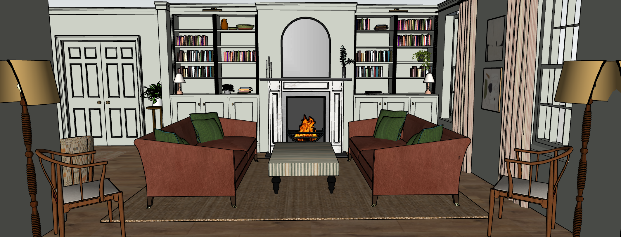 make sure that the sofas and ottoman arent too close the ottoman between the sofa should be a soft topped upholstered and buttoned ottoman with turned wooden legs